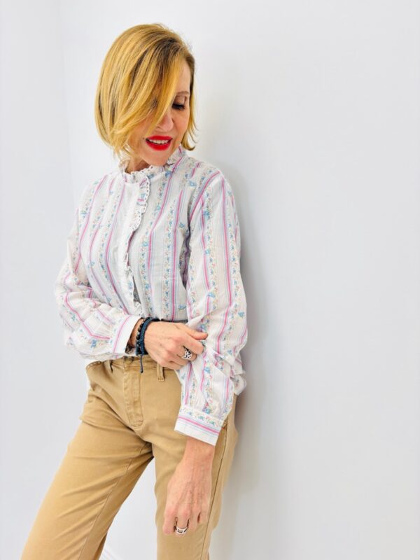 Cette chemise en 100 % coton séduit par son charme délicat et son style intemporel revisité avec finesse. Son imprimé à rayures verticales aux tons doux, ponctué de petits motifs floraux, apporte une touche romantique et féminine tout en restant facile à porter au quotidien. Une pièce lumineuse, idéale pour celles qui aiment les détails subtils et raffinés.