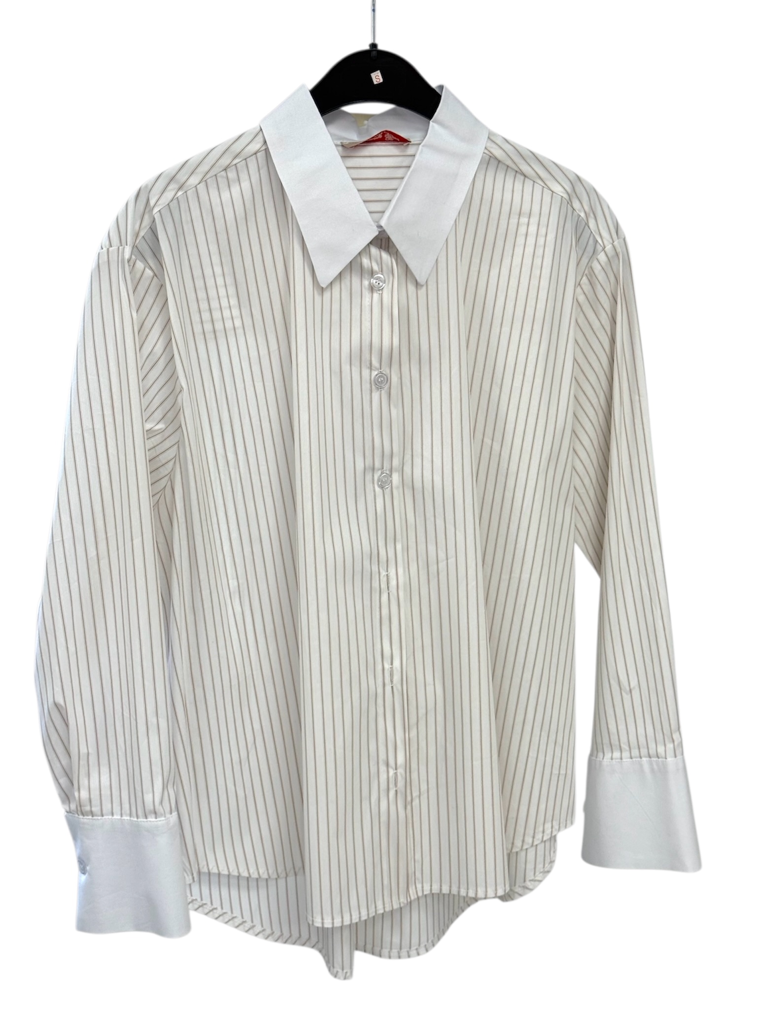 Son jeu de fines rayures verticales allonge visuellement la silhouette et apporte une élégance discrète. Le col blanc contrastant, associé aux poignets blancs, souligne le design et rappelle les codes classiques de la chemiserie, revisités dans une version moderne et féminine. Ces détails contrastants apportent de la lumière et du caractère à la pièce, sans en faire trop.