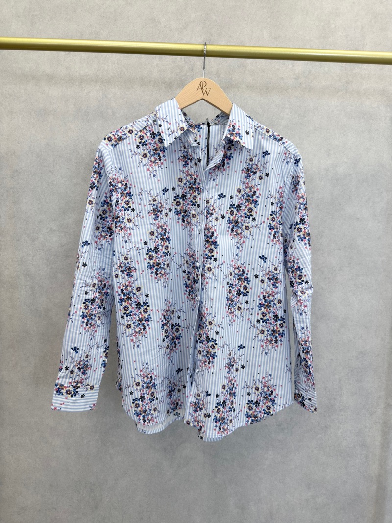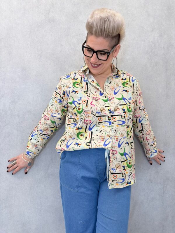 Cette chemise se marie parfaitement avec un pantalon uni bleu, blanc ou beige pour mettre en valeur le motif. Portée nouée à la taille, elle apporte une touche moderne et dynamique à la silhouette.