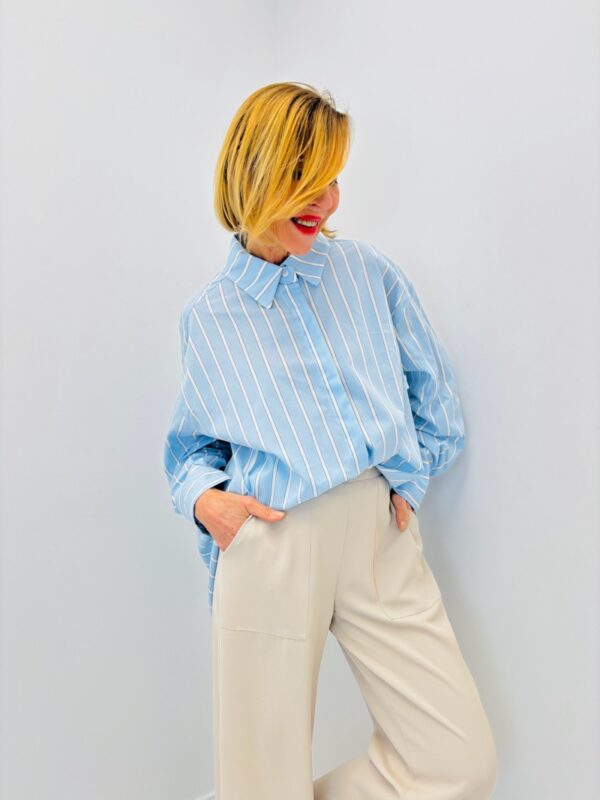 Portée rentrée dans un pantalon taille haute ou un pantalon fluide, cette chemise crée une silhouette chic et contemporaine. Elle se marie parfaitement avec des tons neutres comme le beige, le blanc ou l’écru pour un look élégant et lumineux. Associée à des baskets, elle offre un style casual chic très actuel ; avec des mocassins ou des escarpins, elle devient idéale pour une tenue plus habillée, professionnelle ou urbaine, tout en restant confortable et facile à porter.