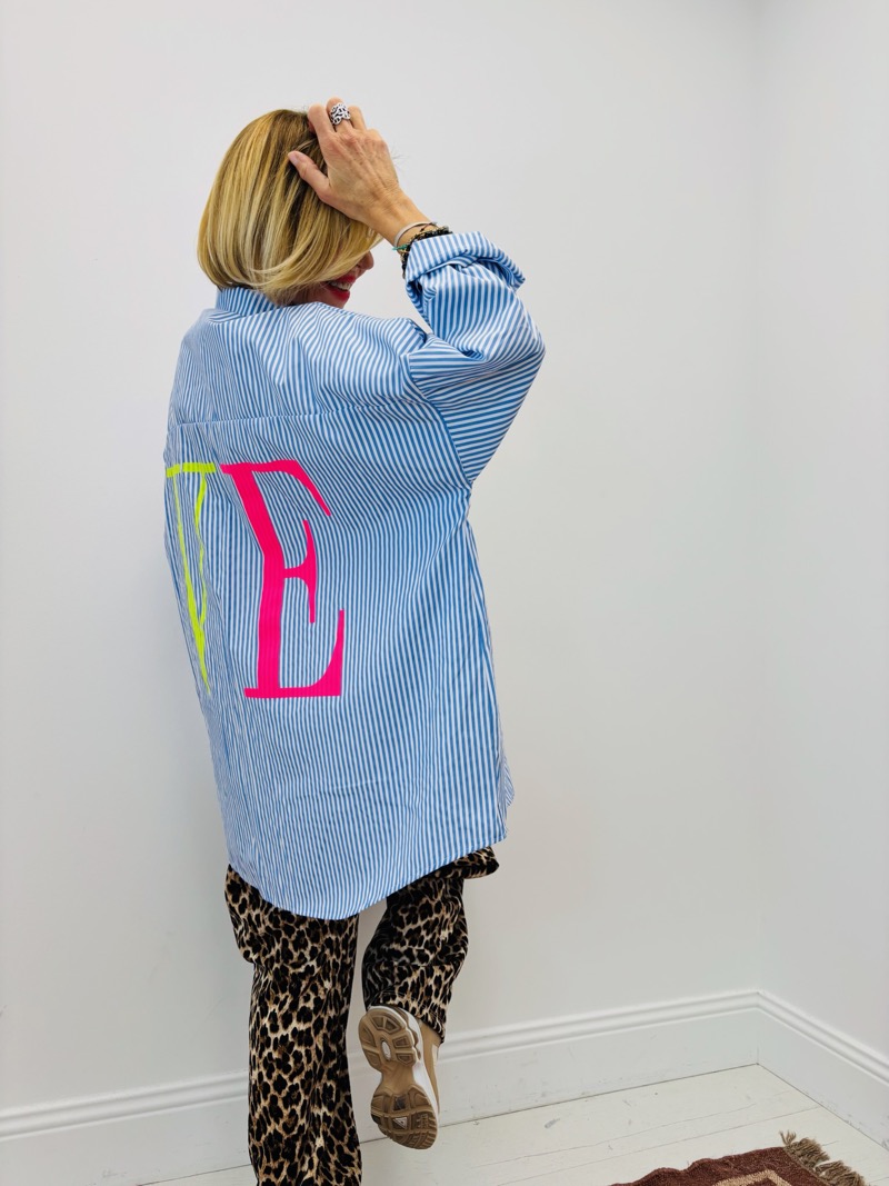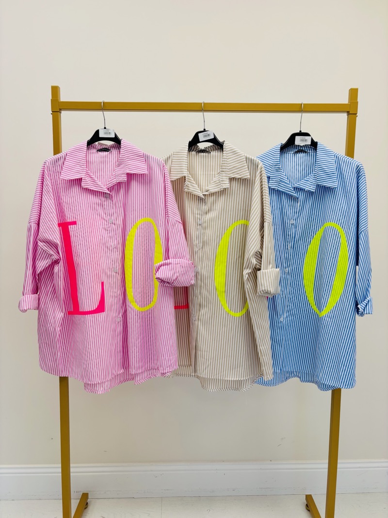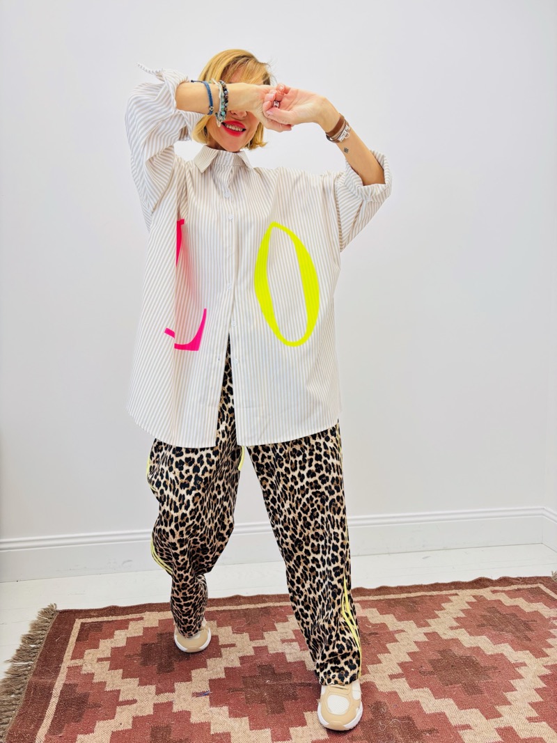 Cette chemise rayée LOVE revisite le classique de la chemise oversize avec une touche audacieuse et ultra tendance. Son imprimé rayures verticales apporte structure et modernité, tandis que le lettrage XXL « LOVE » en coloris néon crée un effet visuel fort et assumé.