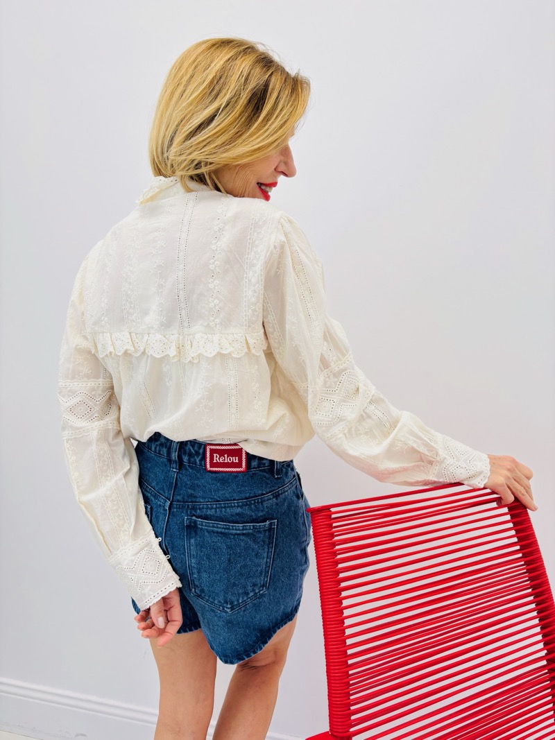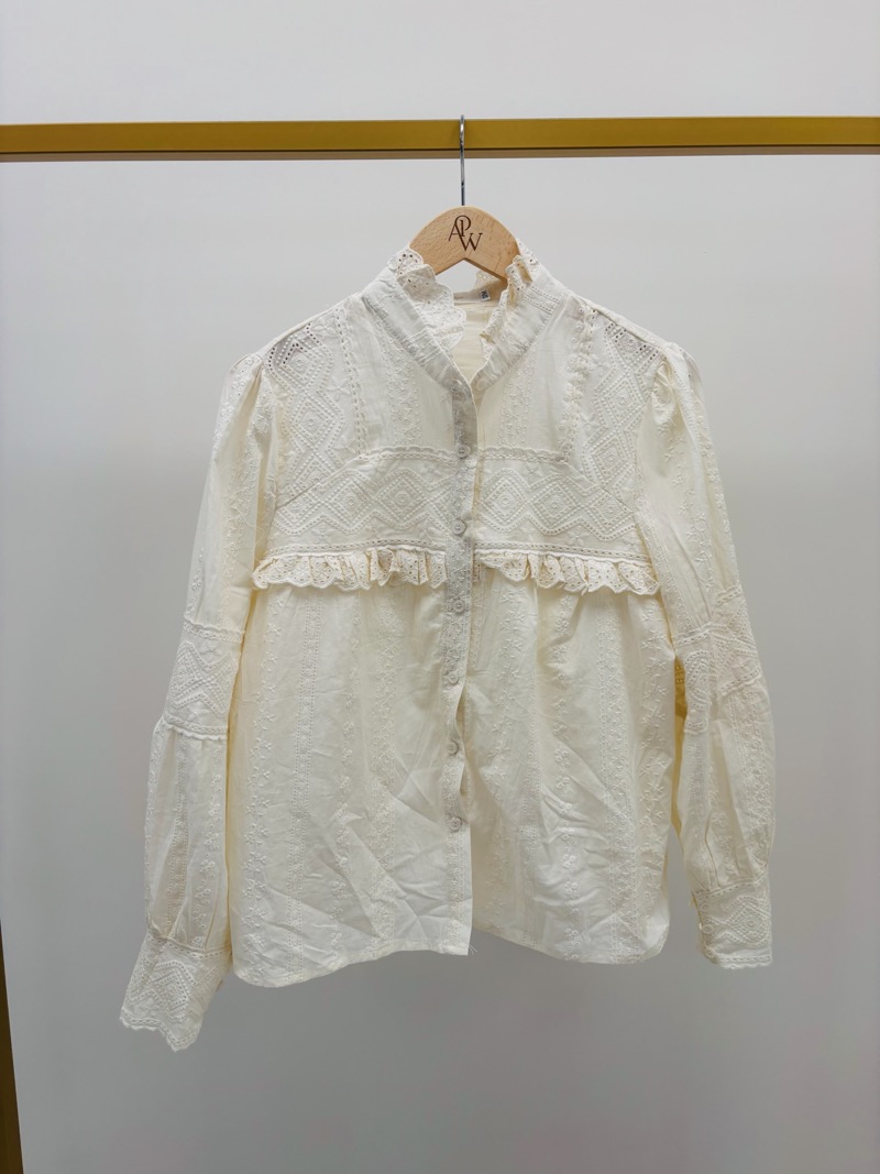 Cette chemise incarne tout le charme d’un vestiaire féminin délicat et raffiné. Son coloris écru lumineux, associé à un travail de broderies ton sur ton et de détails ajourés, lui donne une allure romantique et premium, idéale pour enrichir une sélection boutique avec une pièce intemporelle.