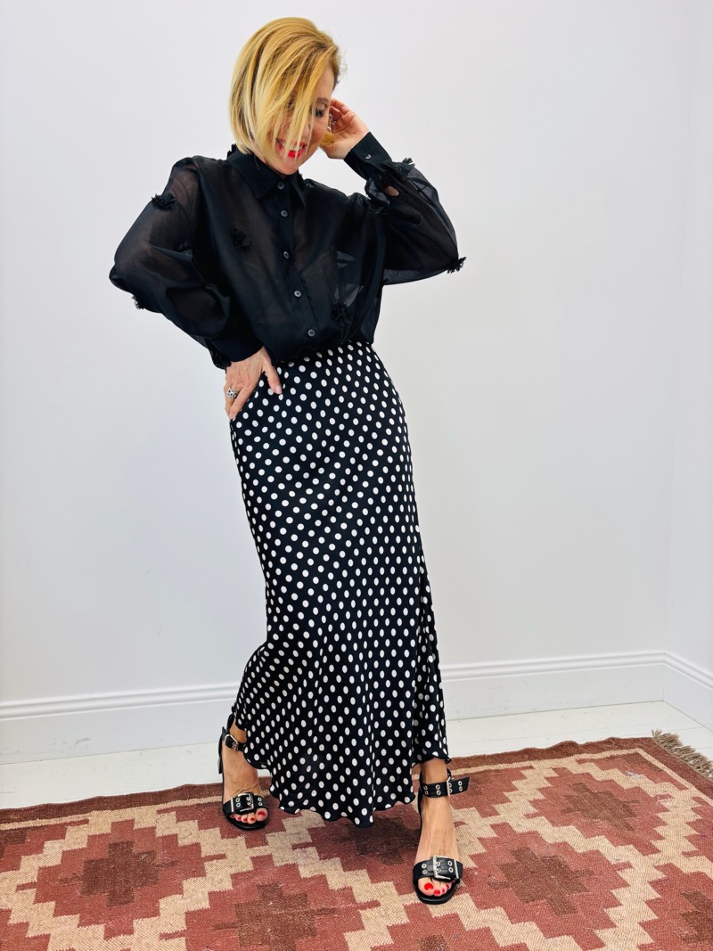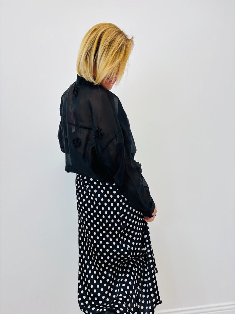 Associée à une jupe fluide à pois, elle crée un contraste subtil entre transparence et imprimé graphique, pour une silhouette féminine et moderne. En version noire, elle devient une pièce statement idéale pour un look de soirée élégant ou un ensemble chic du quotidien.