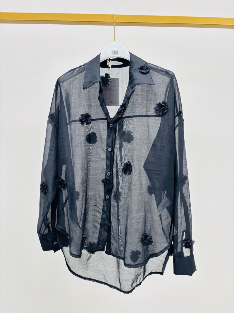 Délicate et sophistiquée, cette chemise transparente ornée de fleurs en relief incarne une féminité moderne tout en subtilité. Sa matière légère à base de lyocell offre un tombé fluide et vaporeux, créant un jeu de transparence élégant sans jamais être excessif.
