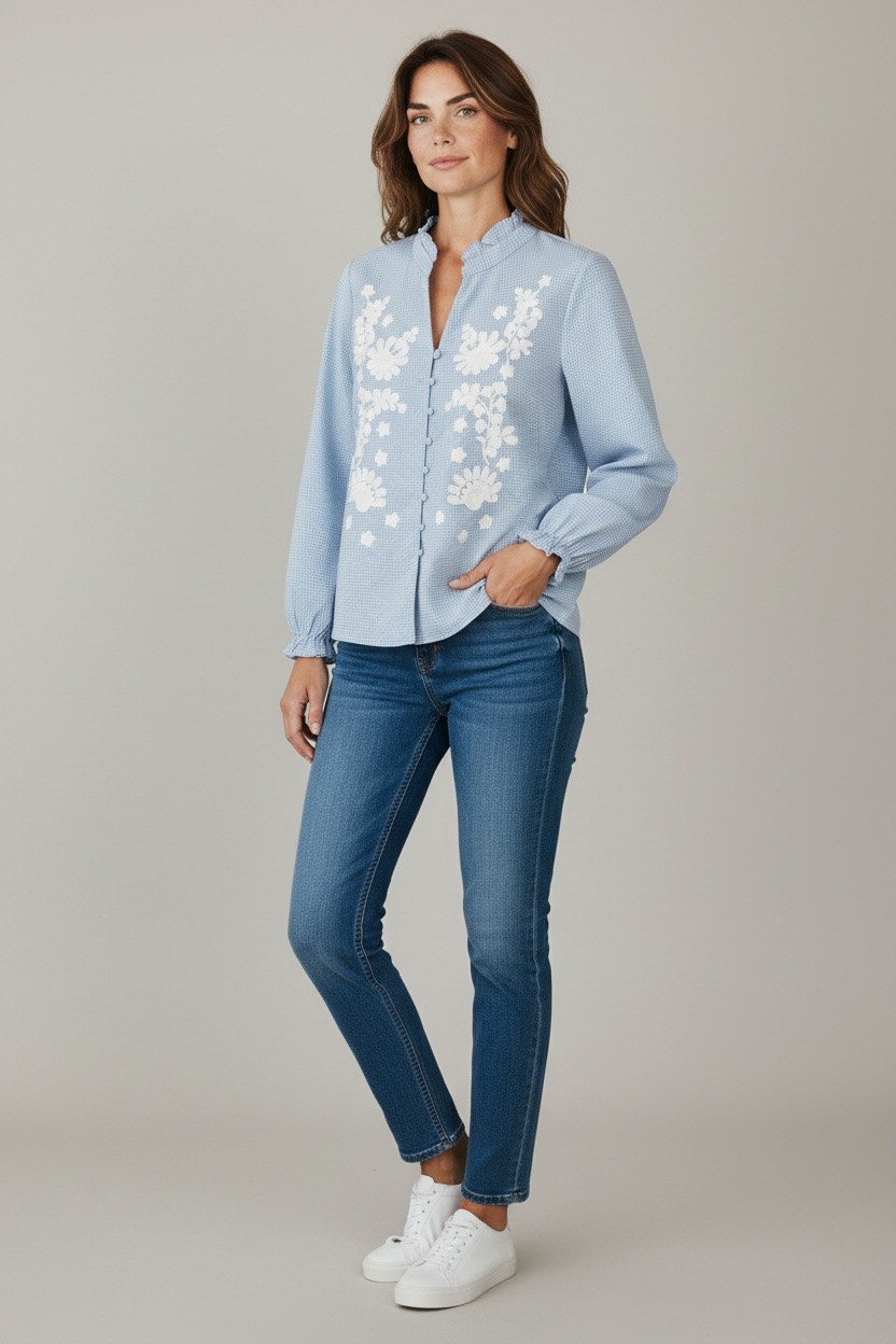 Cette chemise vichy brodée incarne parfaitement l’équilibre entre charme romantique et allure casual chic. Confectionnée en 100 % coton, elle offre une matière légère, respirante et agréable à porter au quotidien. Son motif vichy délicat apporte une touche intemporelle, tandis que les broderies florales blanches en relief subliment la pièce avec élégance et féminité.