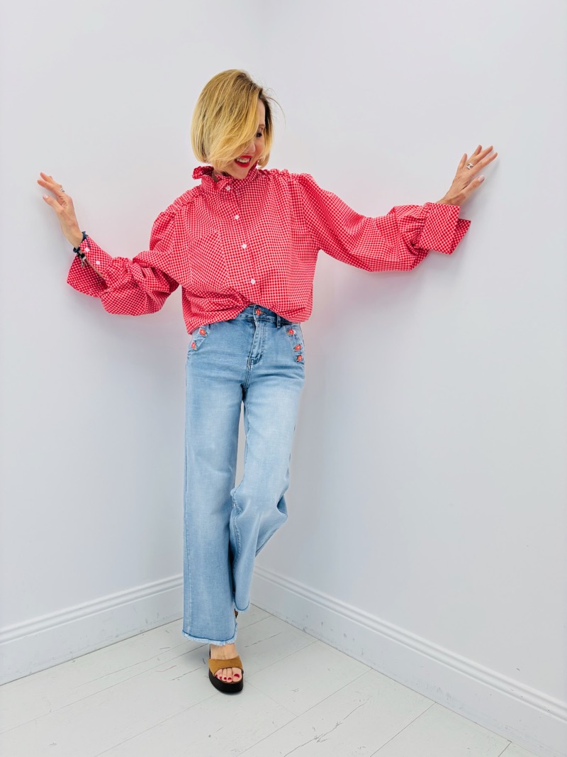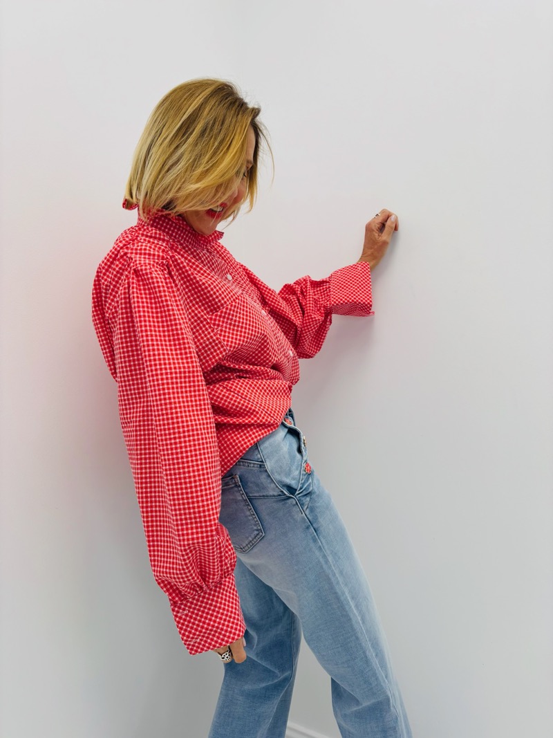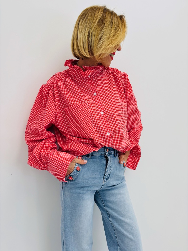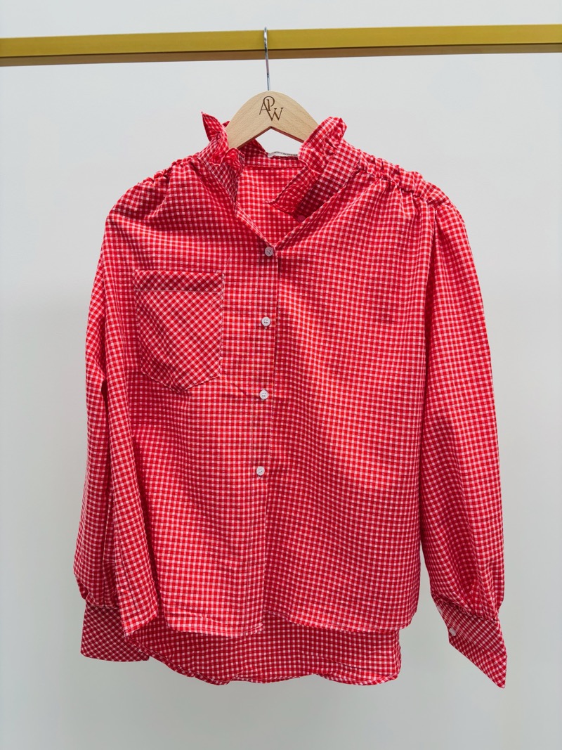 Cette chemise vichy revisite un grand classique avec une touche moderne et féminine. Son motif à carreaux intemporel est sublimé par un col légèrement froncé qui apporte du volume et une élégance subtile à la silhouette.