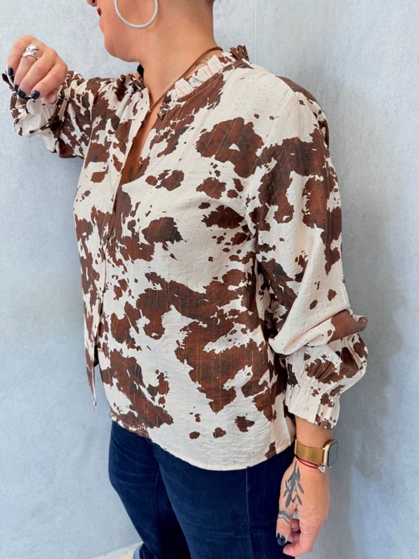 Apportez une touche originale et tendance à vos tenues avec ce chemisier fluide au motif tacheté façon animal. Son imprimé bicolore marron et beige donne immédiatement du caractère à votre look, tout en restant facile à associer.