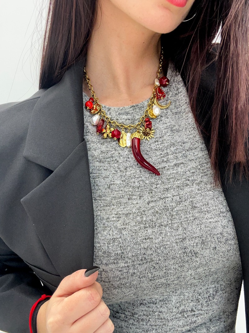 Style : collier orné de multiples pendentifs charms (perles, fleurs, soleils, coquillage, lune, corne).