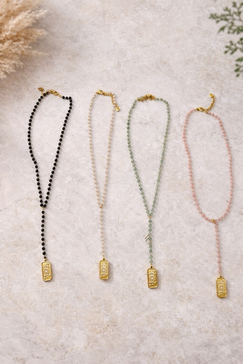 Disponible en plusieurs coloris (noir, blanc, vert d’eau, rose poudré), ce collier s’adapte à tous les styles et toutes les saisons. Sa forme légèrement allongée avec pendentif central crée un effet visuel élancé, parfait pour sublimer le décolleté.