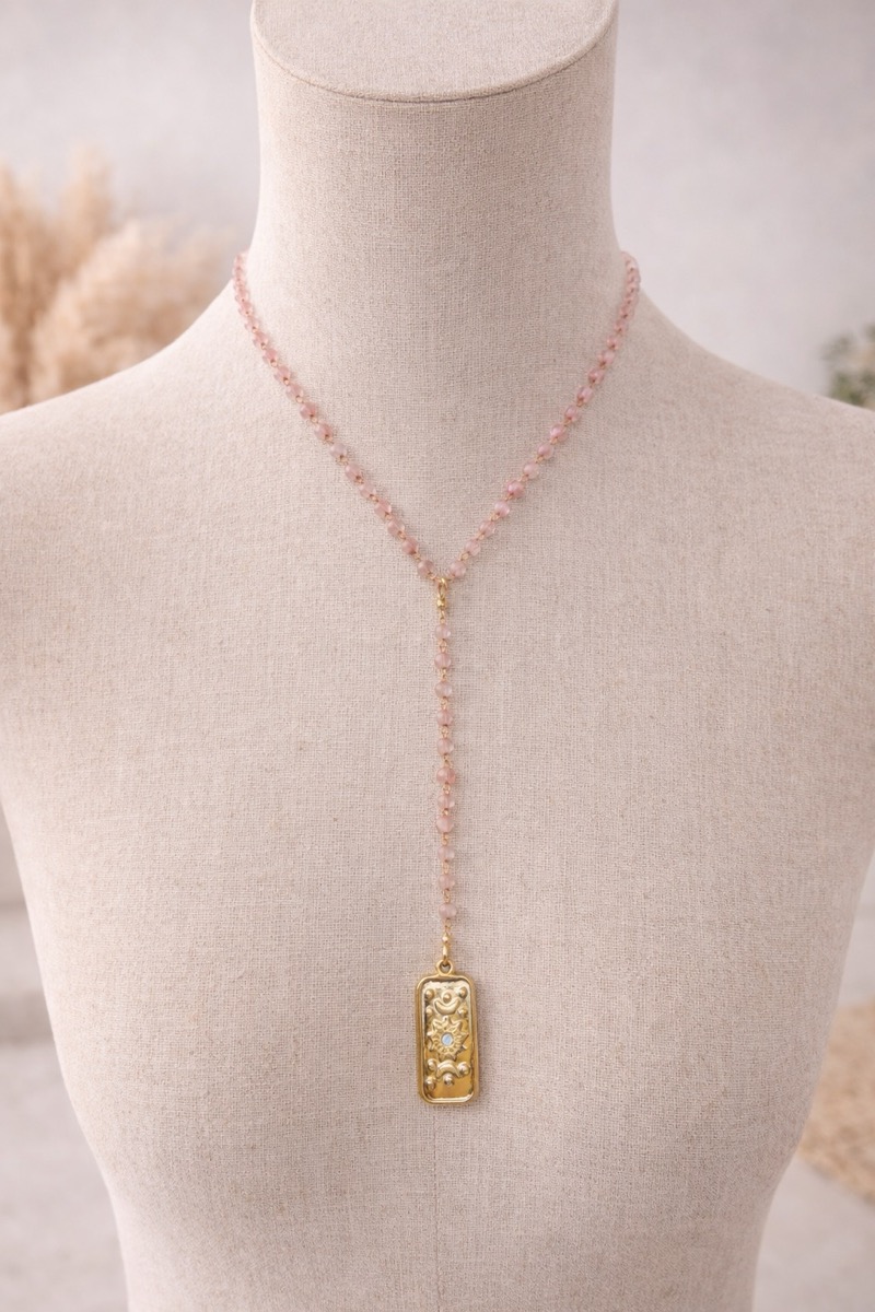 Apportez une touche de raffinement à votre sélection avec ce collier en perles délicates, sublimé par un pendentif doré au design travaillé. Une pièce intemporelle qui allie finesse, modernité et élégance.