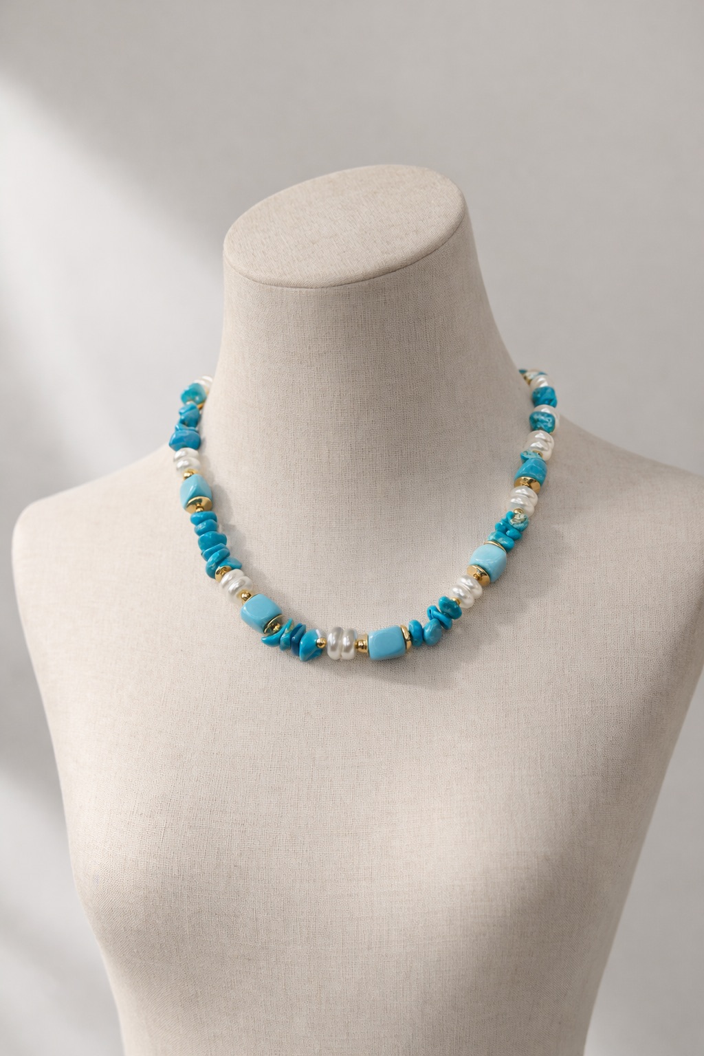 Mélange de perles turquoises, blanches et détails dorés