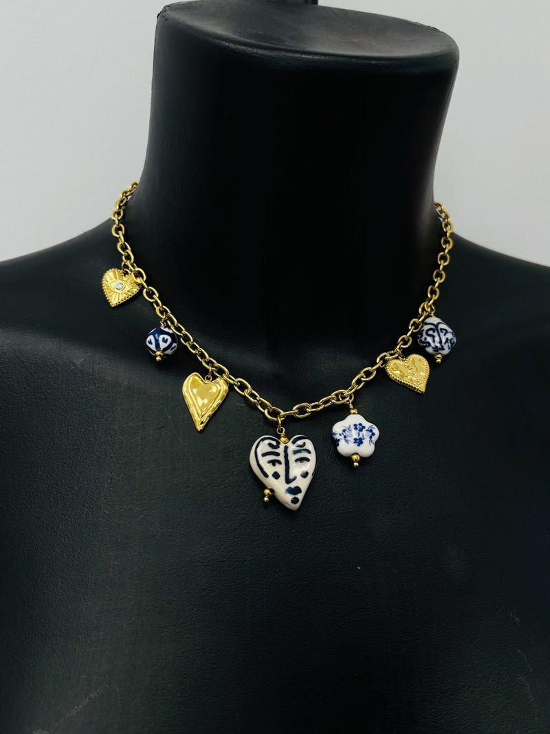 Délicat et plein de caractère, ce collier en porcelaine associe subtilement l’élégance du doré à la finesse des motifs bleu intense inspirés de la céramique traditionnelle. Monté sur une chaîne maillon dorée au style affirmé, il se compose de plusieurs breloques en alternance : cœurs dorés texturés, perles rondes en porcelaine blanche et bleue, fleur délicate et pendentif cœur central orné de motifs graphiques noirs.