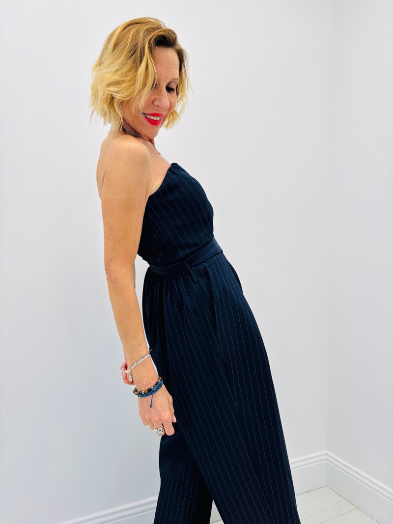 Portée avec des sandales à talons, des baskets ou des espadrilles, cette combinaison crée une silhouette élégante et moderne. Les rayures verticales allongent la silhouette tandis que la ceinture structure la taille.