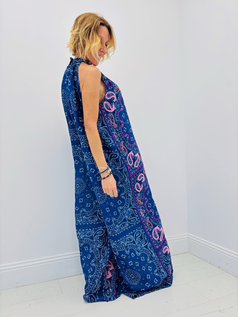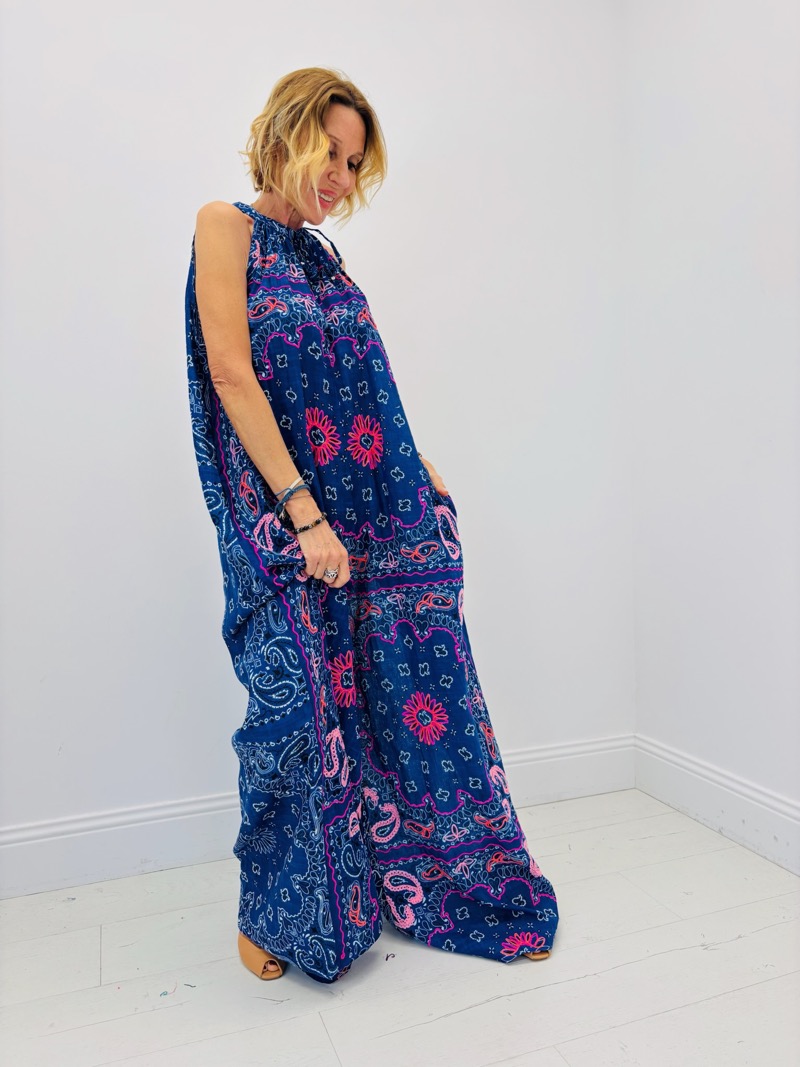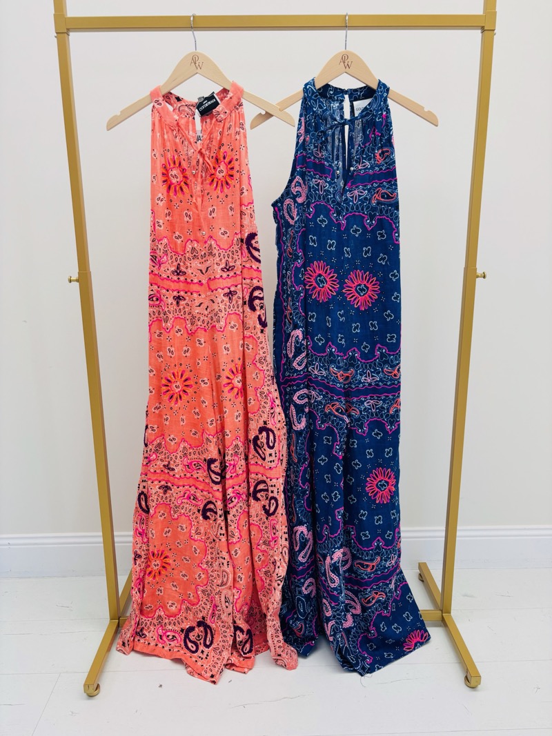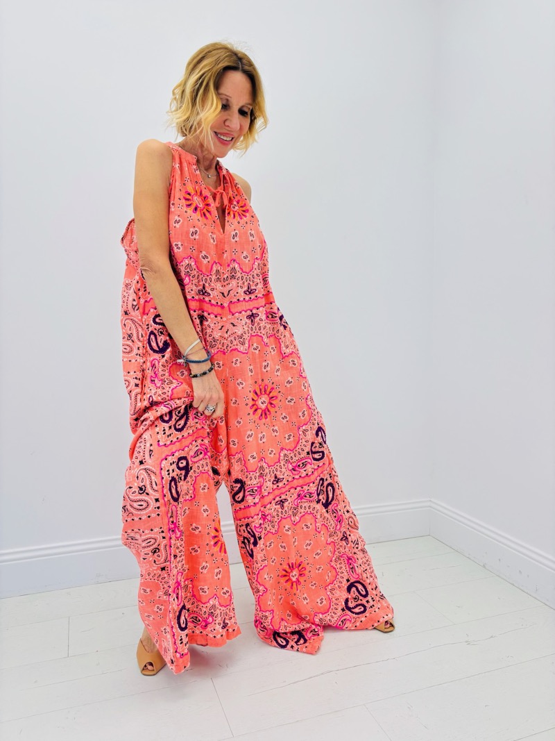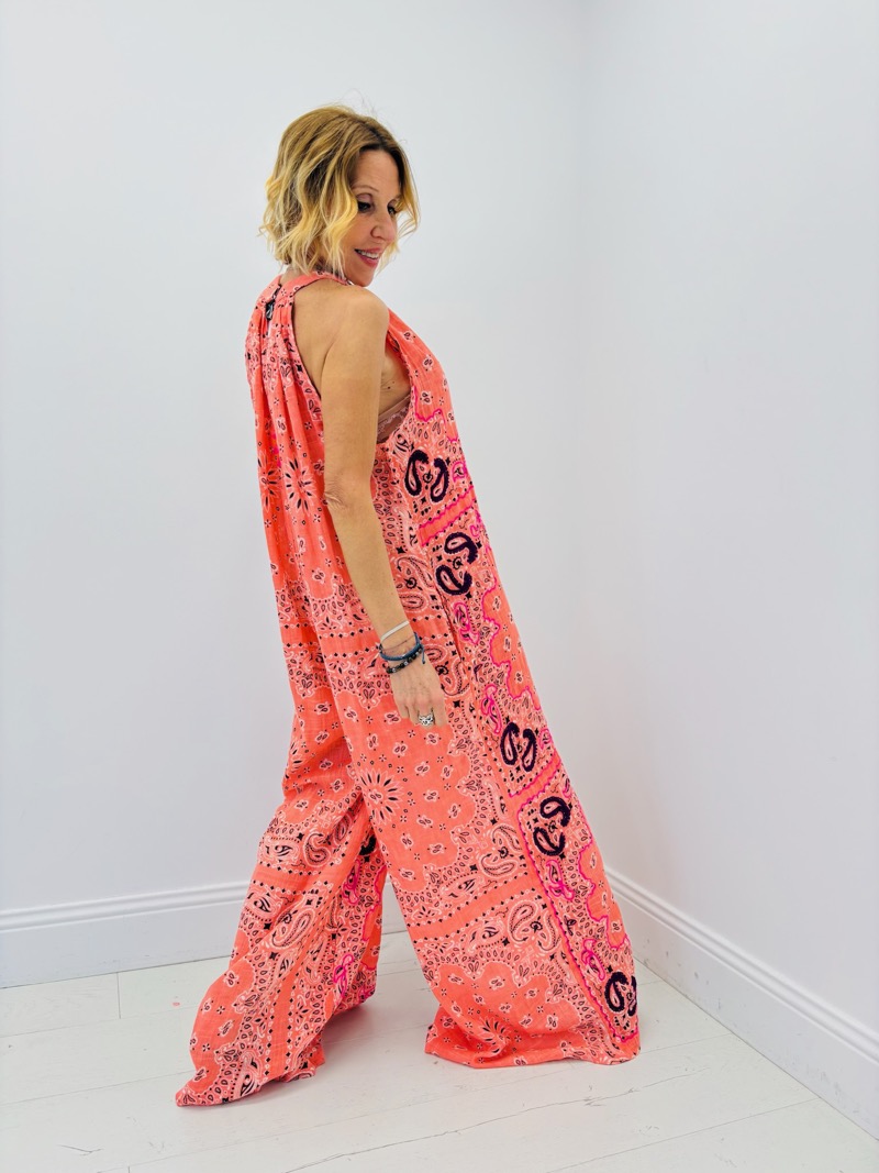 Cette combinaison longue au style bohème chic est une pièce forte de la saison, parfaite pour apporter une touche de couleur et de légèreté à toute collection estivale. La Combinaison Bolina séduit par son imprimé graphique inspiré des motifs bandana et floraux, revisités dans des teintes vibrantes qui apportent une allure à la fois moderne et décontractée.