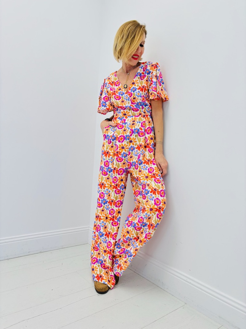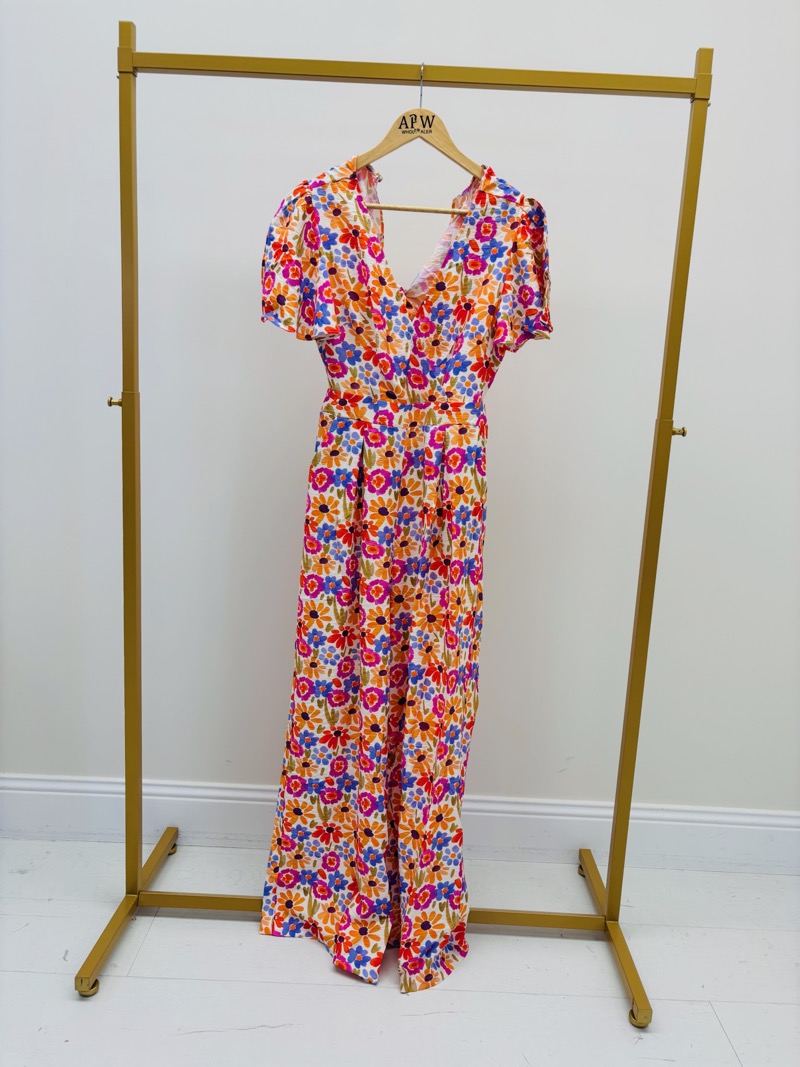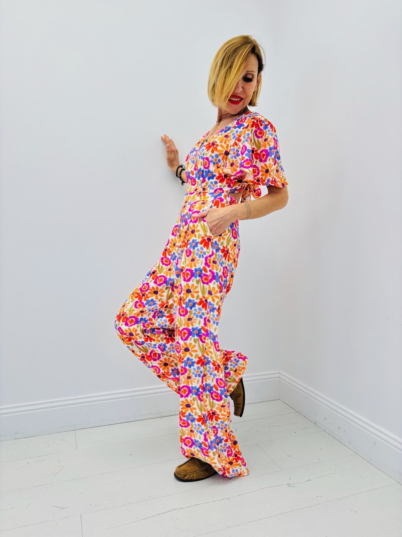 Cette combinaison fluide incarne parfaitement l’élégance estivale avec une touche bohème vibrante. Son imprimé floral multicolore, mêlant des teintes chaudes et lumineuses, apporte une vraie fraîcheur visuelle et en fait une pièce forte idéale pour dynamiser une sélection en boutique.