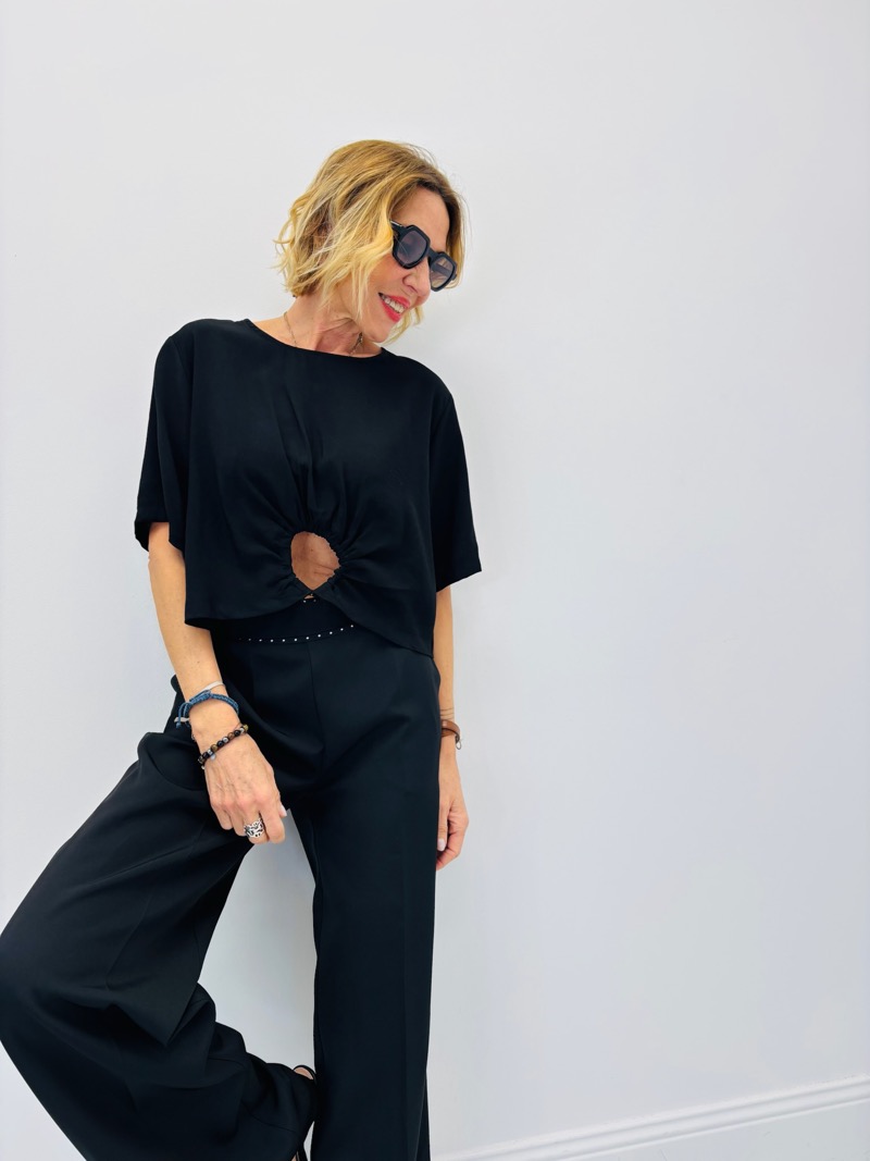 Le modèle se distingue par son drapé central avec ouverture circulaire, qui crée un effet graphique élégant tout en structurant le vêtement. Ce détail apporte une touche mode tout en conservant un style sobre et raffiné.