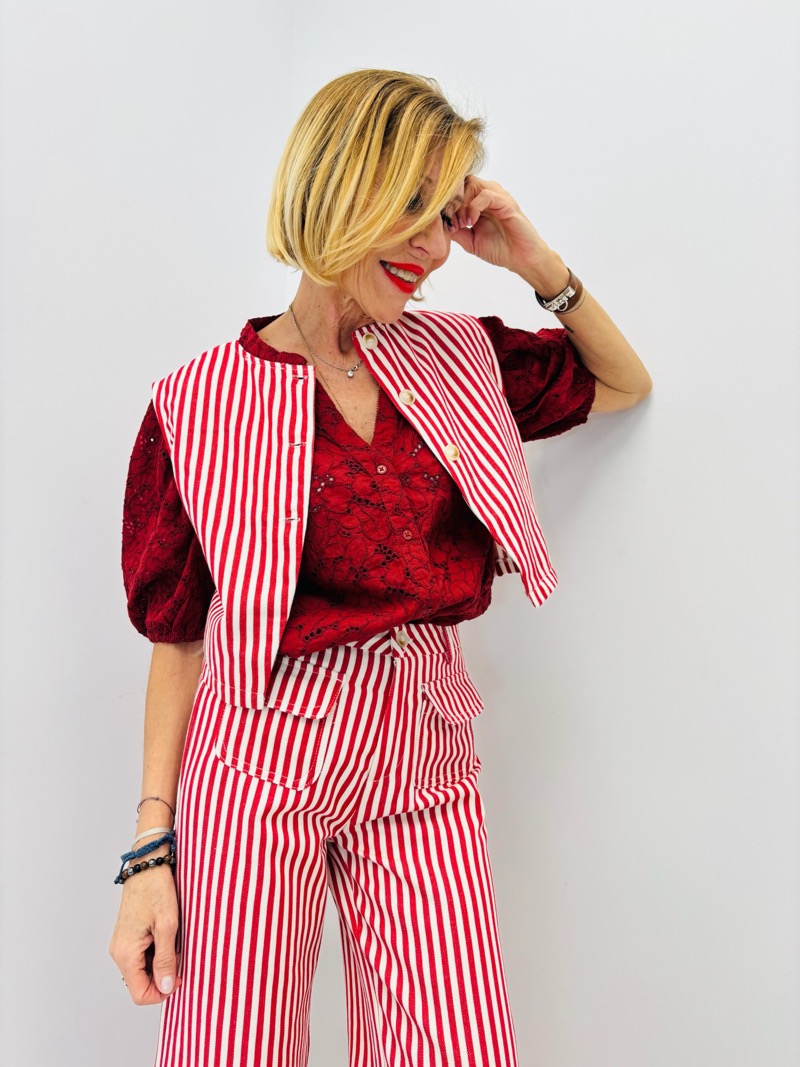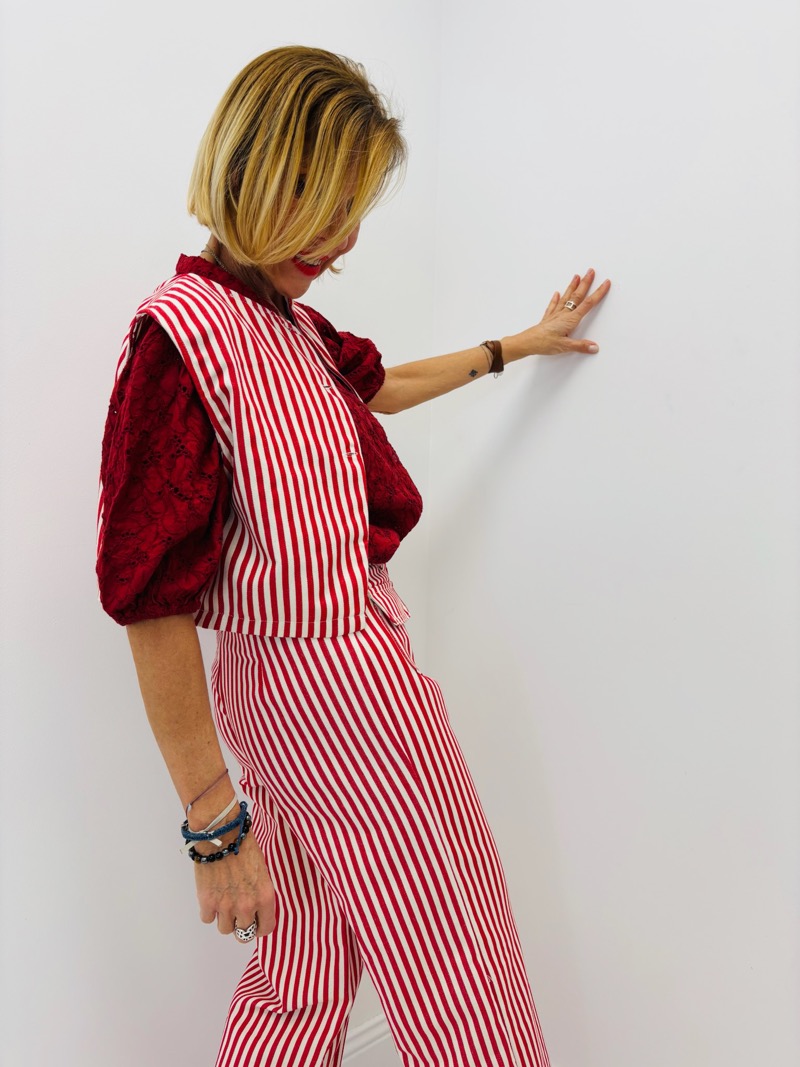 Ultra tendance et parfaitement dans l’air du temps, ce crop top rayé est la pièce forte de la saison. Avec son jeu de rayures verticales rouges et blanches, il apporte une touche graphique, dynamique et estivale à toute silhouette.