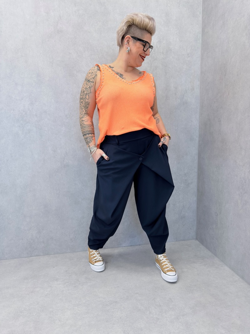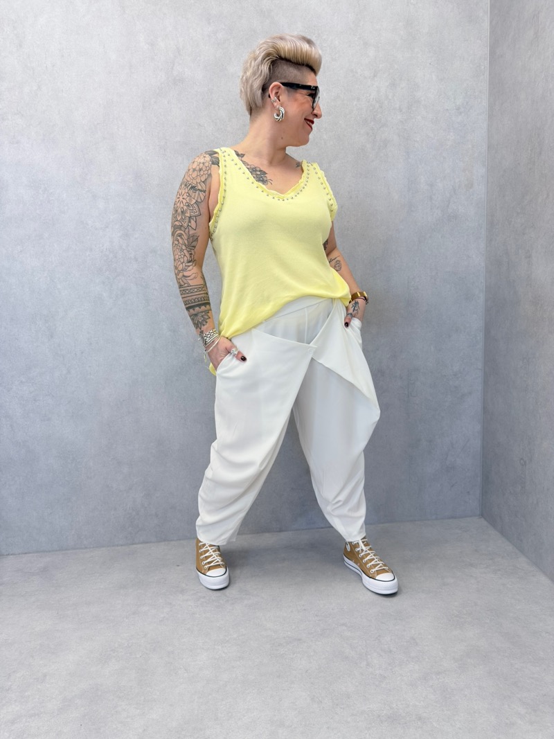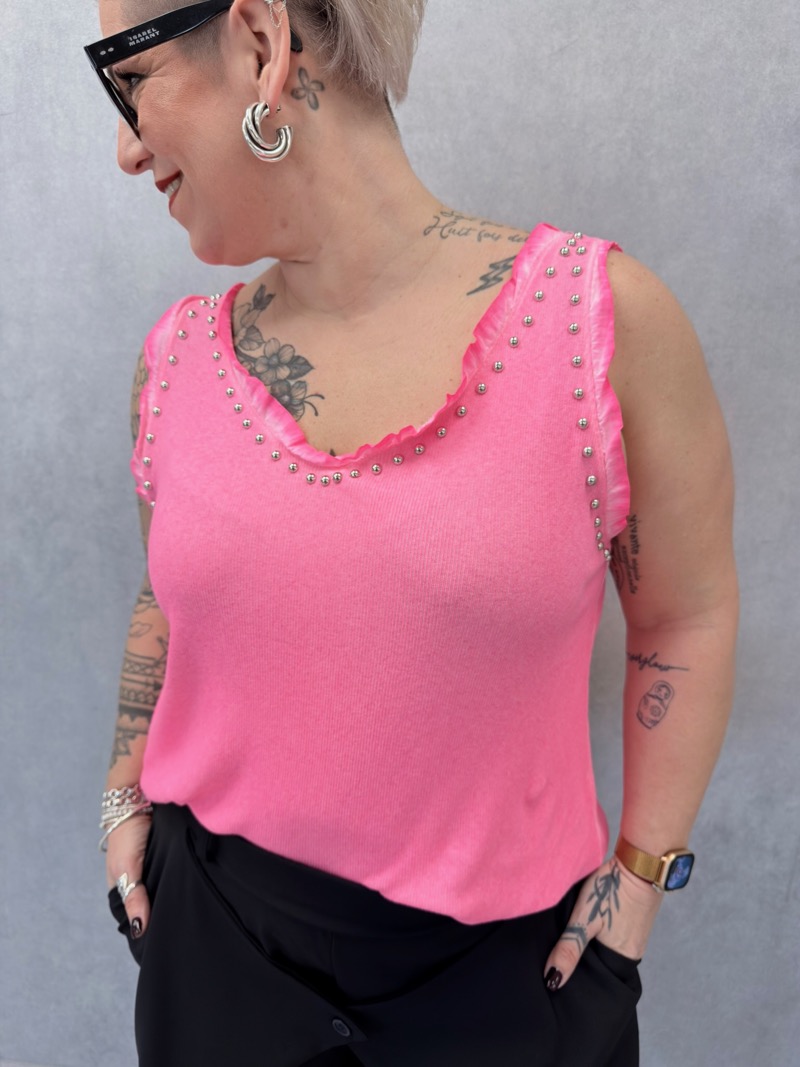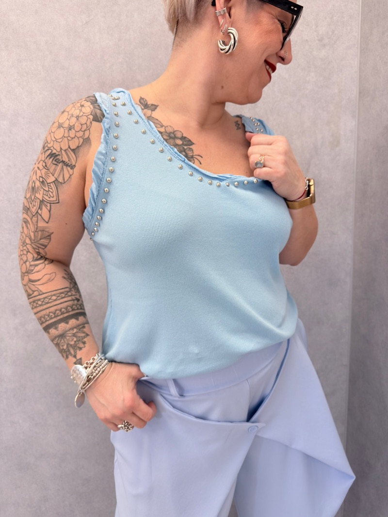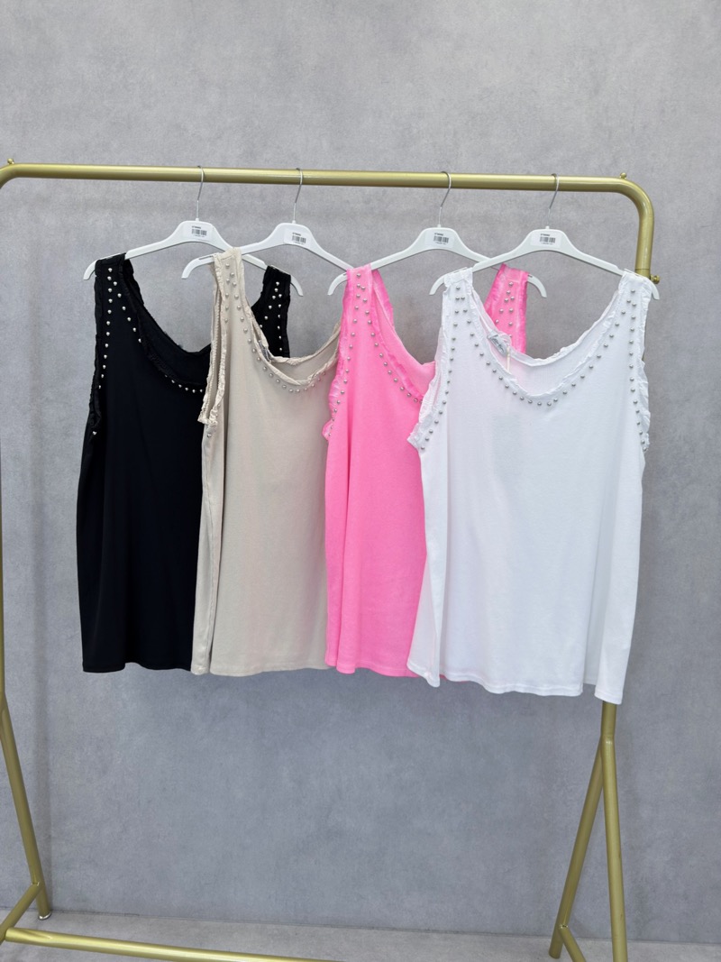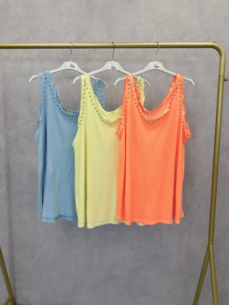 Le modèle se distingue par ses petits clous décoratifs disposés autour de l’encolure et des emmanchures, qui apportent une touche lumineuse et tendance tout en restant raffinée. Cette finition subtile donne du caractère au débardeur tout en conservant un style facile à porter.