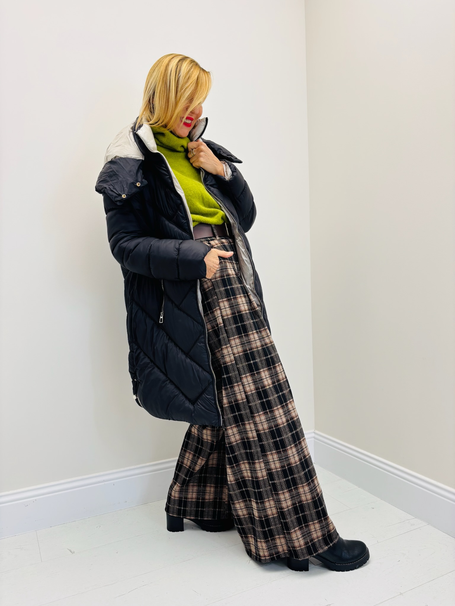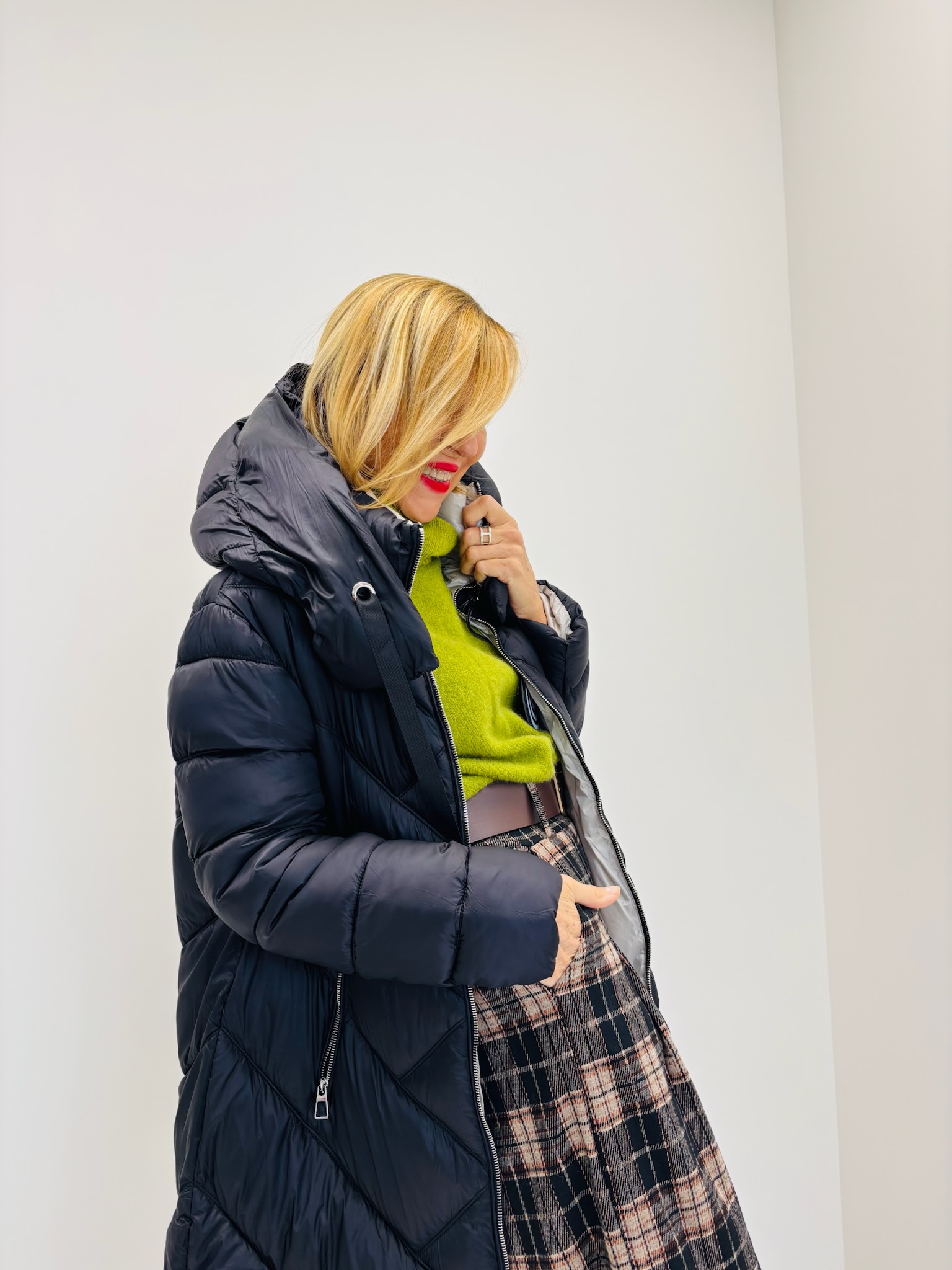 Pratique, chaude et ultra-tendance, cette doudoune longue réversible est la pièce parfaite pour affronter l’hiver avec élégance. Sa coupe mi-longue légèrement trapèze et son matelassage en chevrons allongent la silhouette tout en offrant une isolation optimale.