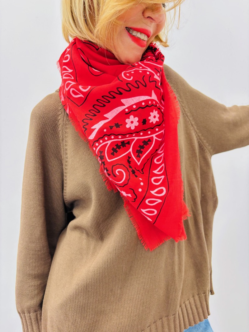 Cette écharpe à motif cachemire bandana est un indispensable du dressing, à la fois intemporel et facile à porter. Son imprimé iconique, inspiré du bandana traditionnel, apporte une touche graphique et mode qui traverse les saisons sans se démoder. Les motifs cachemire finement dessinés créent un bel équilibre entre caractère et élégance.