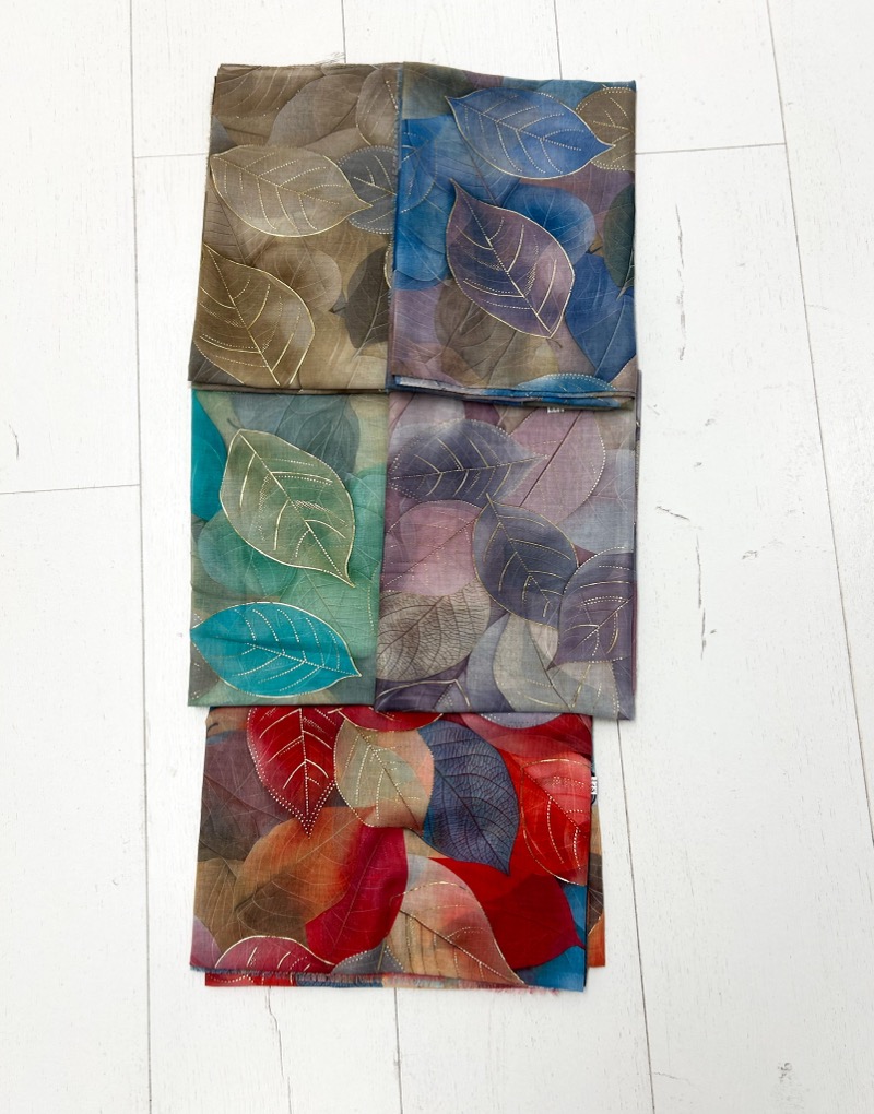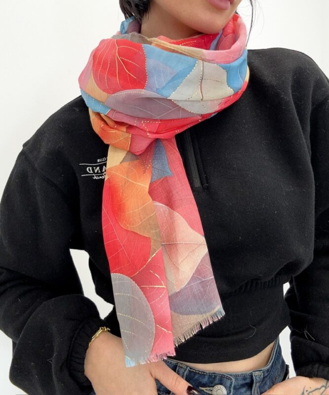 Conçue dans une matière légère et fluide, elle se porte aussi bien en mi-saison qu’en complément d’un look hivernal. Son tombé souple permet de multiples façons de nouage : autour du cou, sur les épaules ou même en accessoire de sac. Les motifs feuillus, aux lignes fines et élégantes, donnent un esprit à la fois chic et naturel.