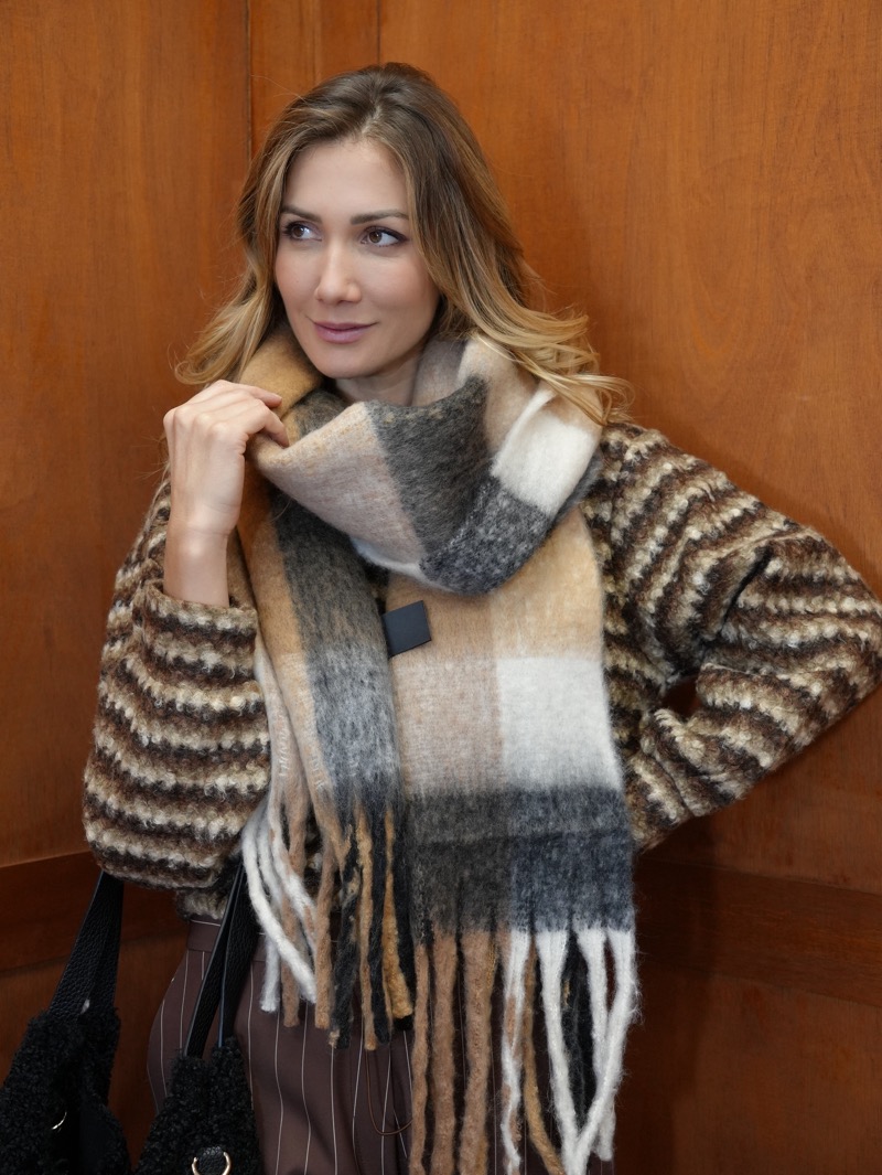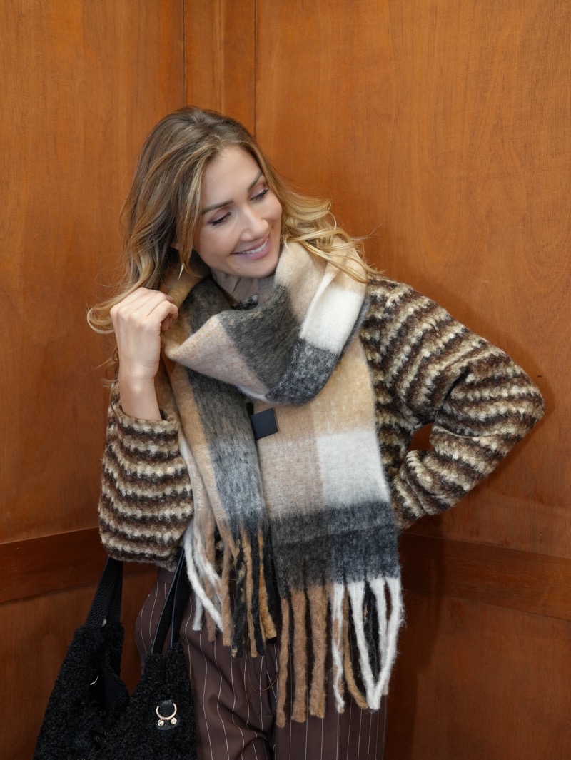Avec un pull à rayures marron/camel et un pantalon rayé. Les couleurs de l’écharpe se fondent parfaitement dans un univers automnal chaleureux.