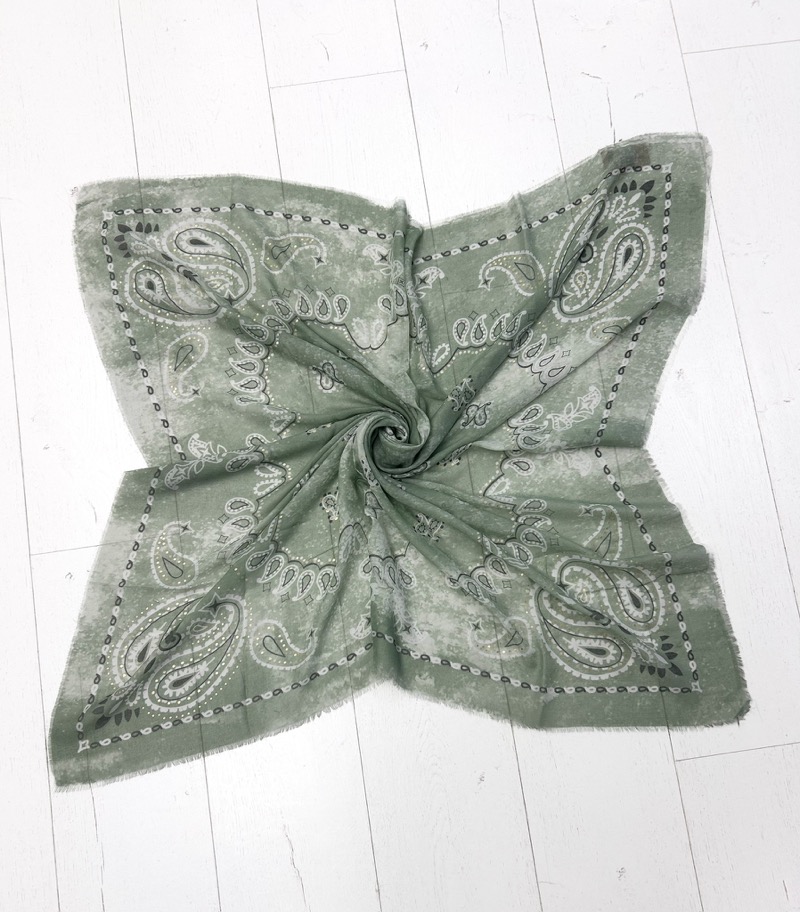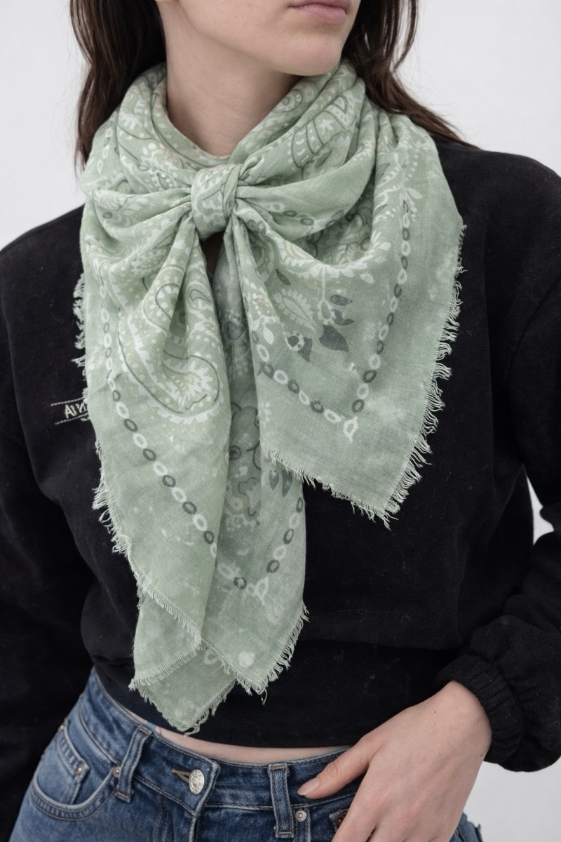 Cette écharpe au motif cachemire revisité séduit par son effet légèrement dégradé et patiné, qui lui donne un charme authentique et très actuel. Inspirée de l’esprit bandana, elle apporte une touche bohème chic tout en restant facile à porter au quotidien.