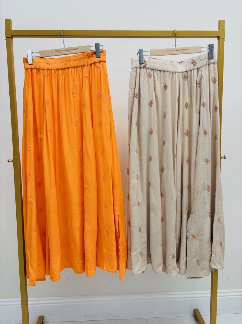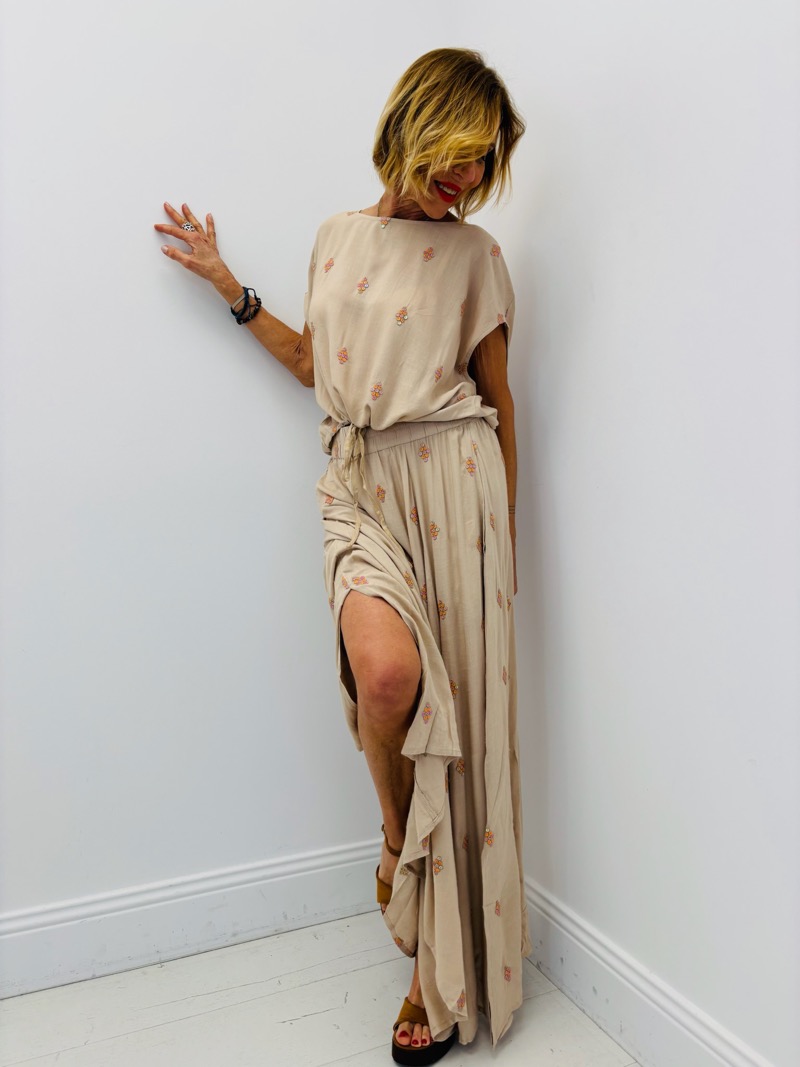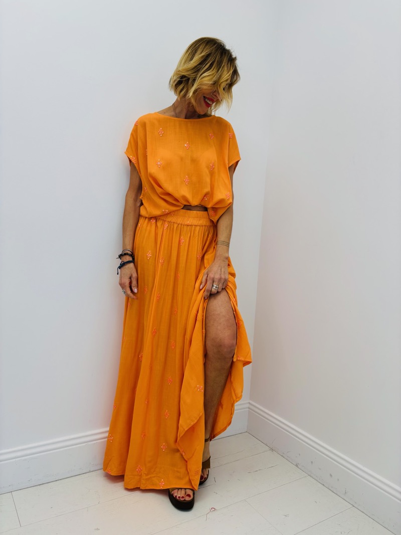 Cet ensemble deux pièces séduit par son élégance naturelle et ses détails subtils. Composé d’un top fluide et d’une jupe longue assortie, il incarne parfaitement un style chic et estival, idéal pour une clientèle à la recherche de confort et de raffinement.