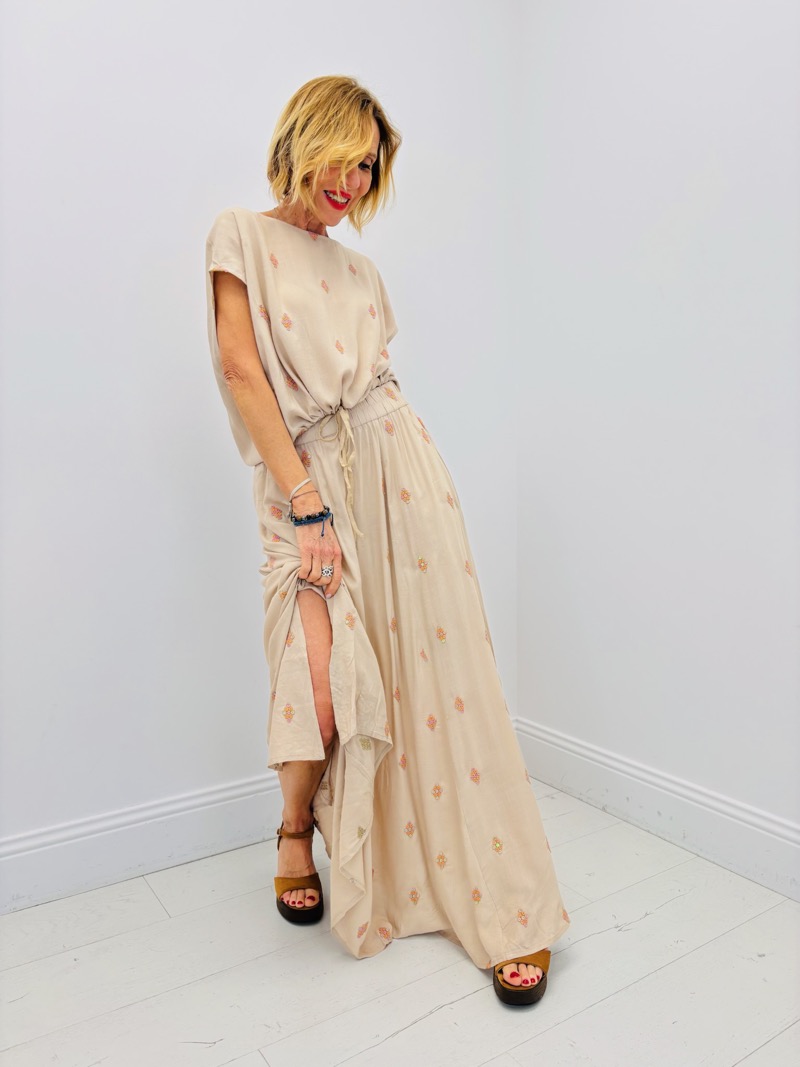 Les délicats sequins brodés apportent une touche lumineuse discrète, sublimant la silhouette sans en faire trop. La matière légère à base de viscose et de lin garantit un tombé fluide, agréable à porter même lors des journées les plus chaudes.