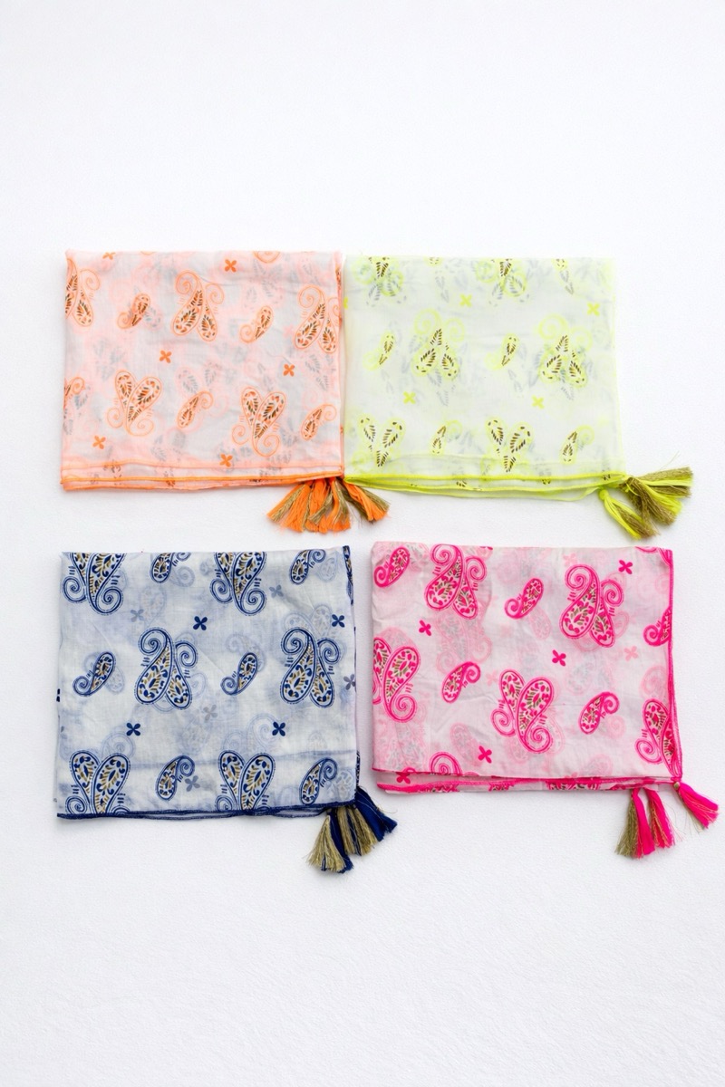 Ce foulard en coton revisite le célèbre motif bandana avec une touche moderne et lumineuse. Confectionné en 100 % coton, il offre une matière légère, douce et respirante, idéale pour la mi-saison comme pour l’été.