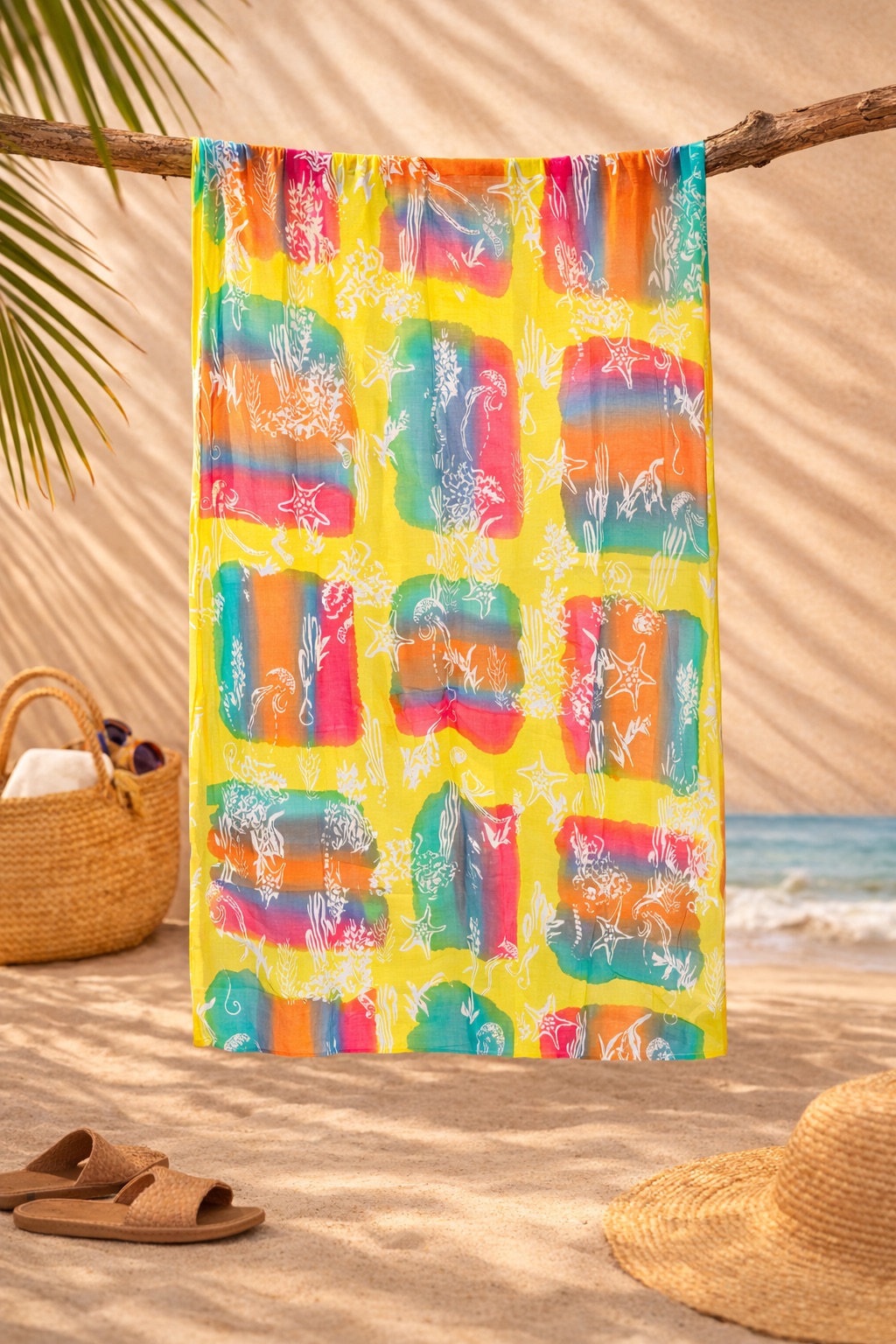 Apportez une touche de couleur et d’évasion à vos collections avec ce foulard en coton aux inspirations estivales. Son imprimé lumineux mêle des aplats multicolores vibrants à de délicats motifs marins dessinés en surimpression : étoiles de mer, coraux et éléments marins qui évoquent instantanément l’univers de la plage et des vacances.