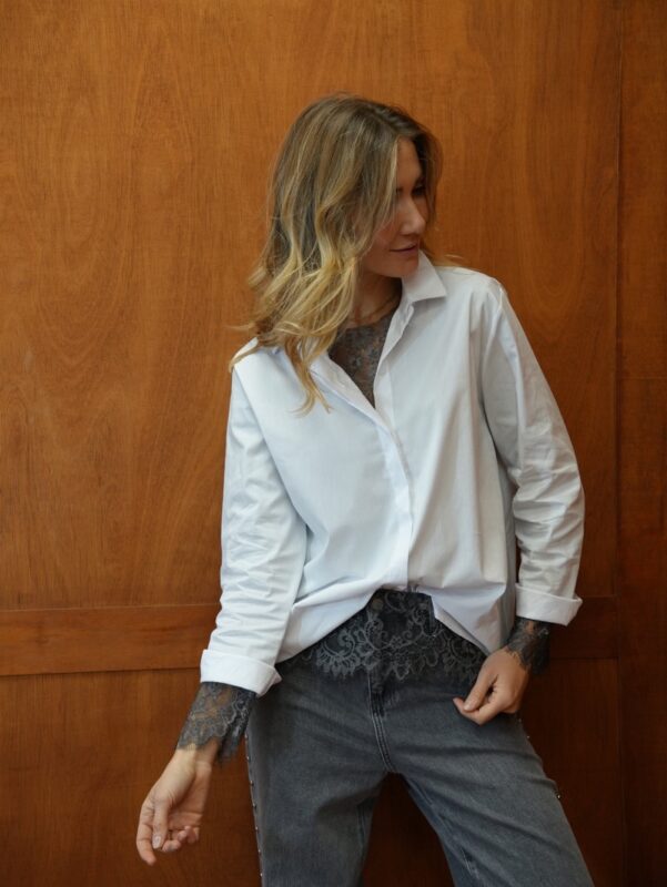Sur la photo, le foulard est porté autour du cou, glissé sous une chemise blanche italienne, apportant une touche colorée et élégante à un look sobre. Le contraste entre le tissu satiné du foulard et le coton de la chemise crée un rendu très chic, idéal pour un look moderne et raffiné.