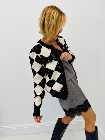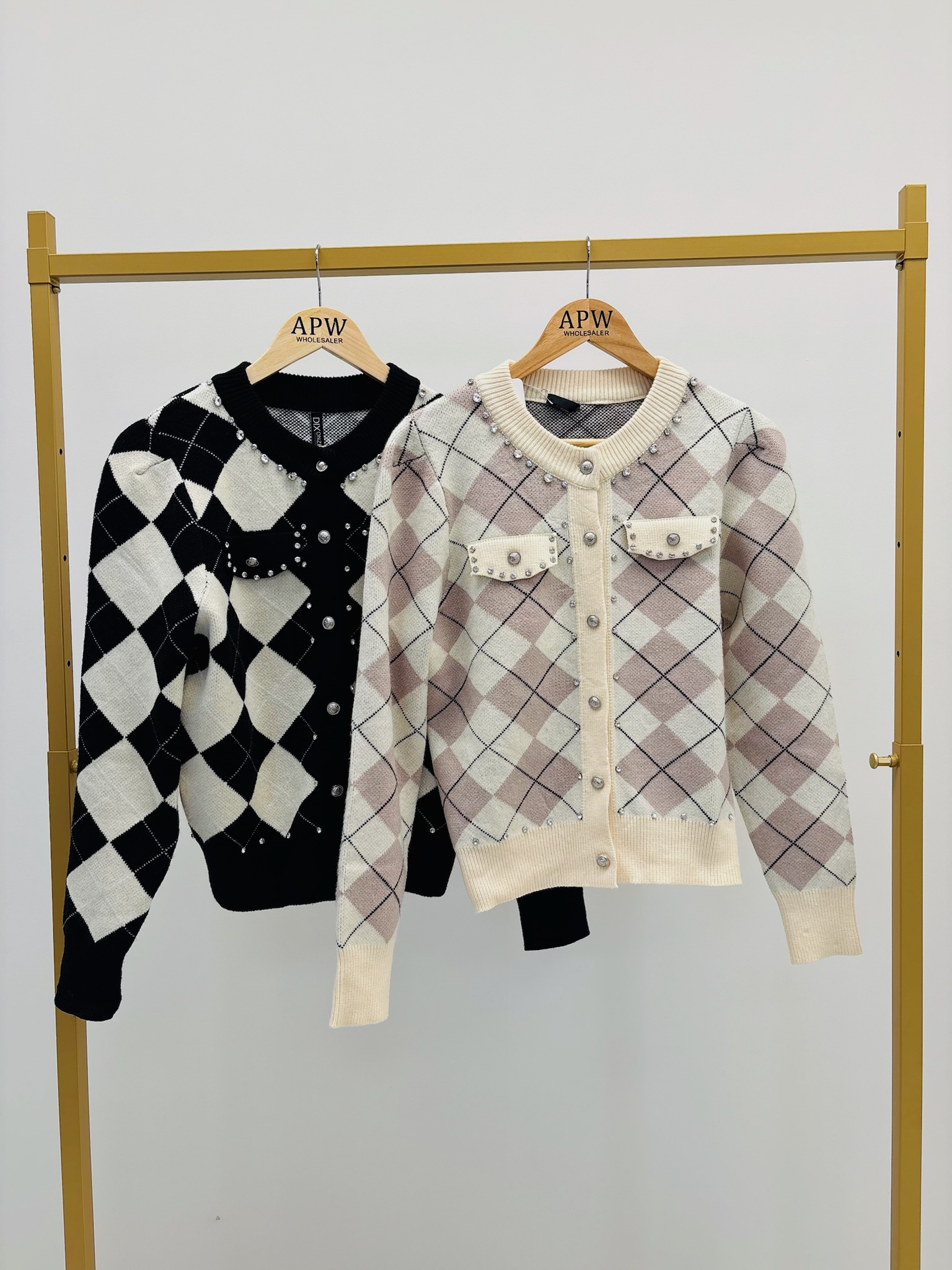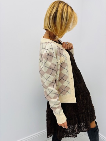 Un gilet raffiné qui mêle le charme vintage du motif argyle et la touche chic des détails bijoux. Sa maille douce et structurée en fait une pièce forte, idéale pour rehausser un look du quotidien.
