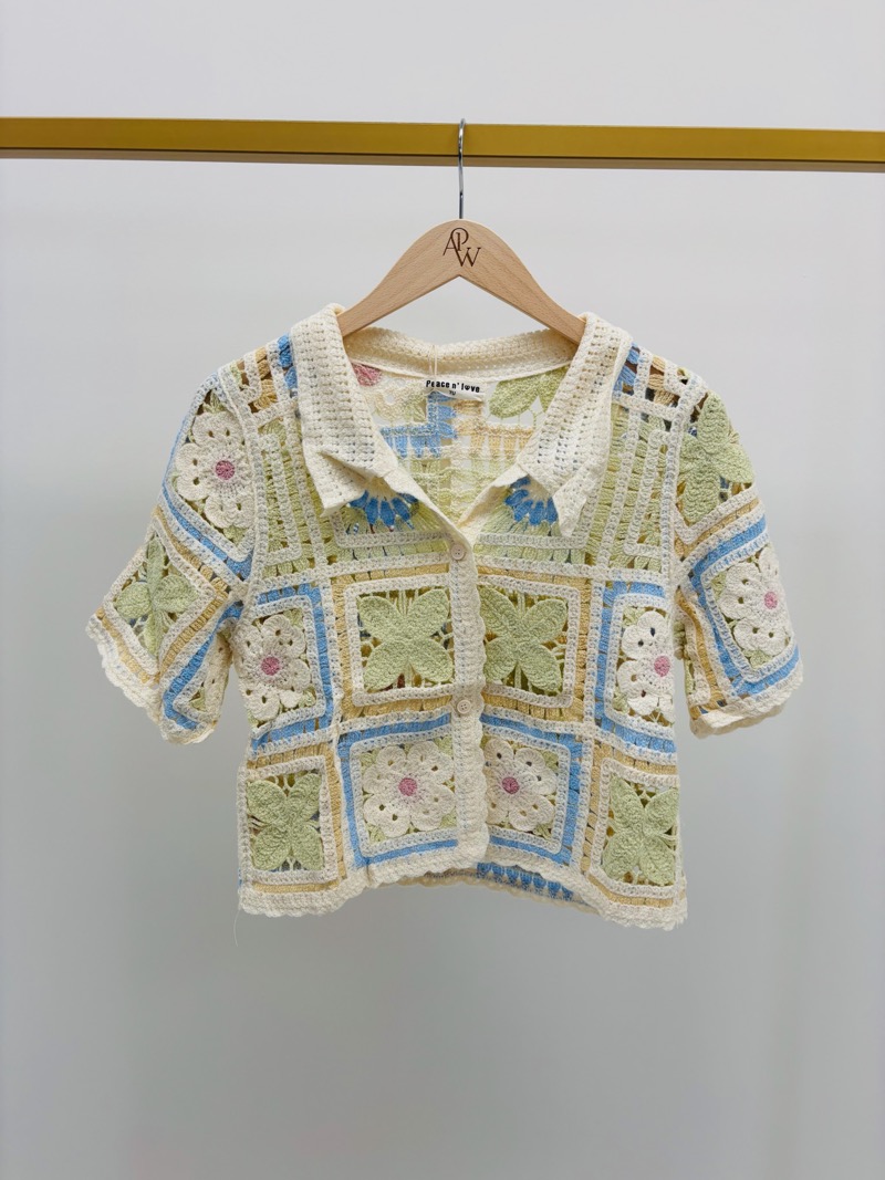 Sa coupe courte et légèrement structurée met en valeur la taille et permet de l’associer facilement à un jean, une jupe ou un short taille haute. Le col chemise en crochet et la fermeture boutonnée ajoutent une touche rétro très tendance.