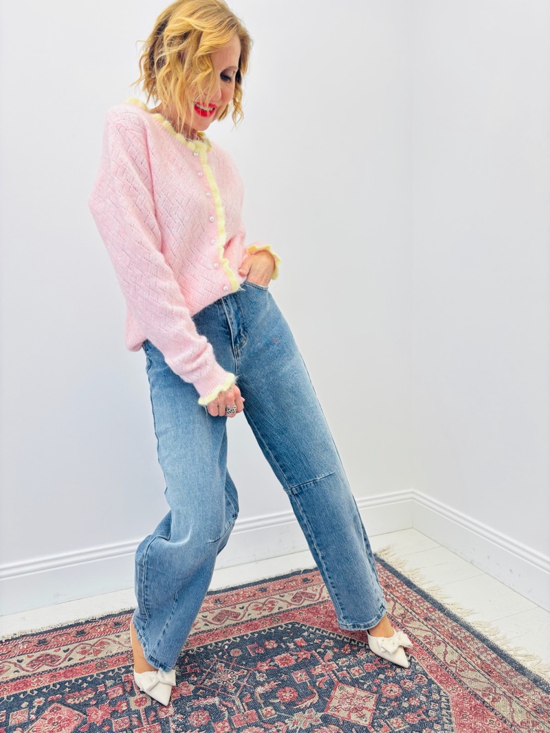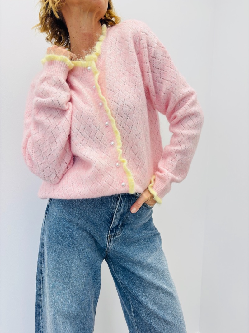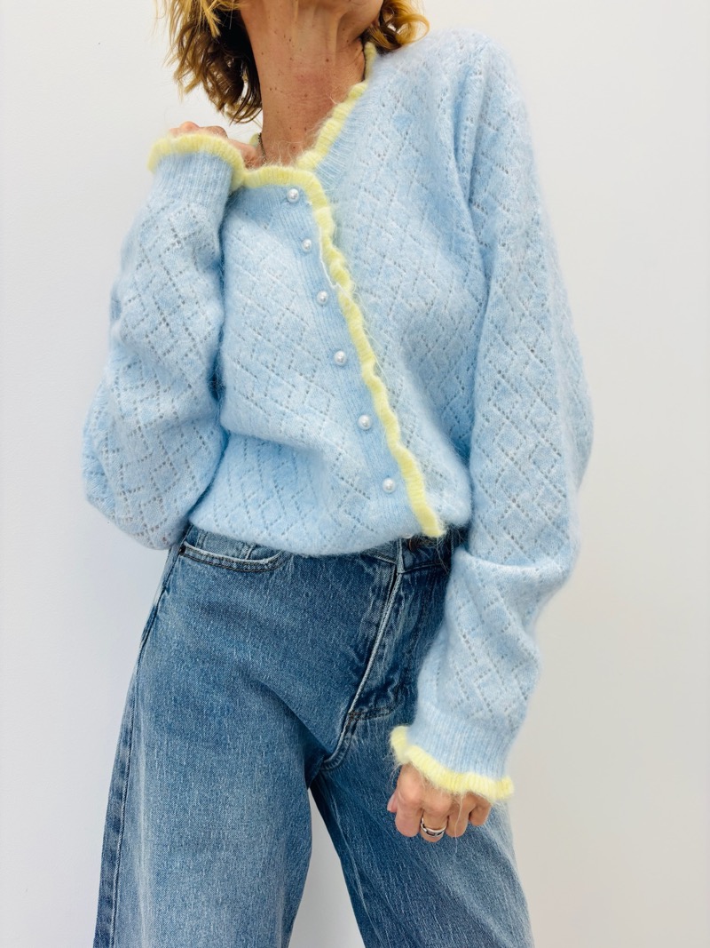 Porté avec un jean, ce gilet apporte une touche douce et féminine à la silhouette. Il se marie parfaitement avec un top uni ou une blouse légère pour un look casual chic. Boutonné, il structure la tenue ; porté ouvert, il apporte de la légèreté et du mouvement.