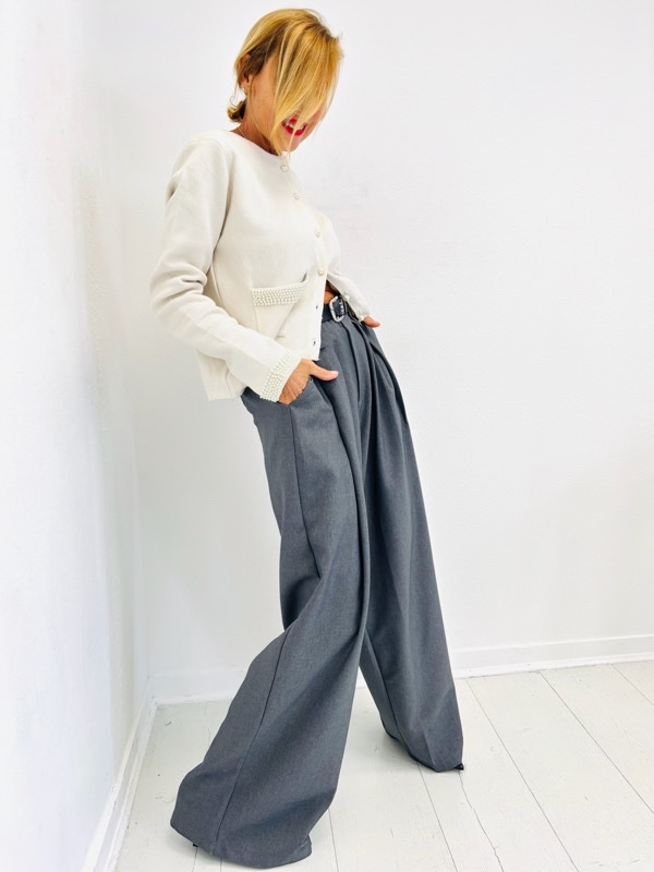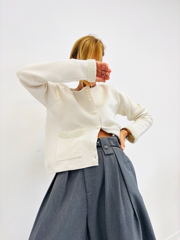 Ce gilet raffiné se distingue par ses détails délicats et féminins. Confectionné dans une maille douce et fluide, il se ferme par une rangée de boutons nacrés et présente deux poches plaquées ornées de perles ton sur ton pour une touche bijou subtile. Les poignets sont également rehaussés d’une finition perlée pour un effet couture.