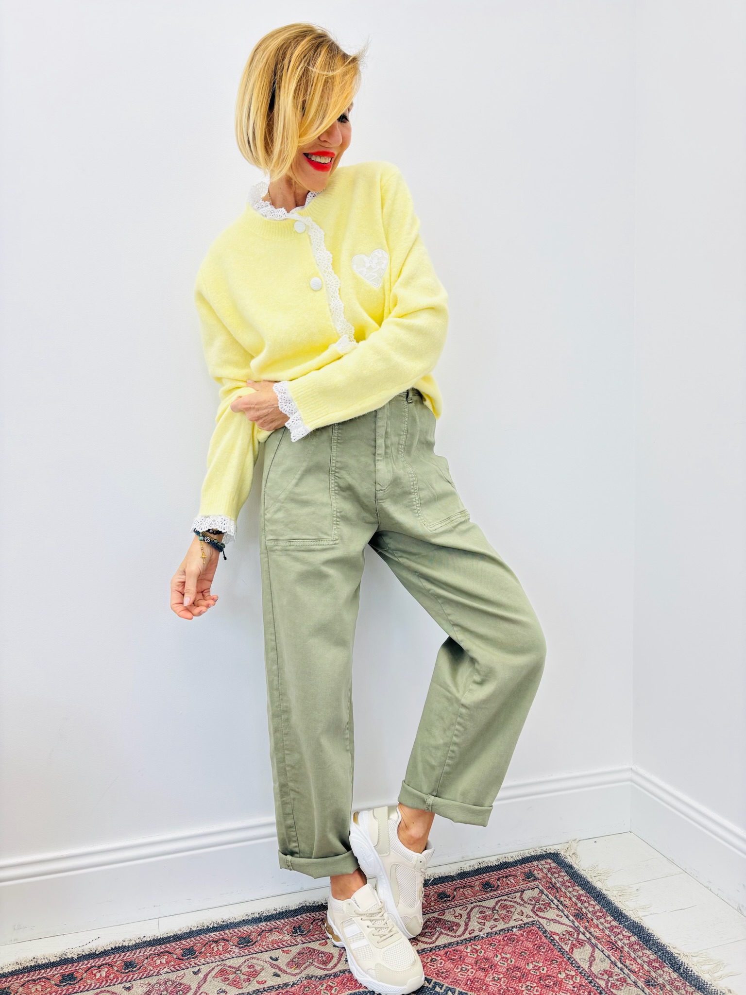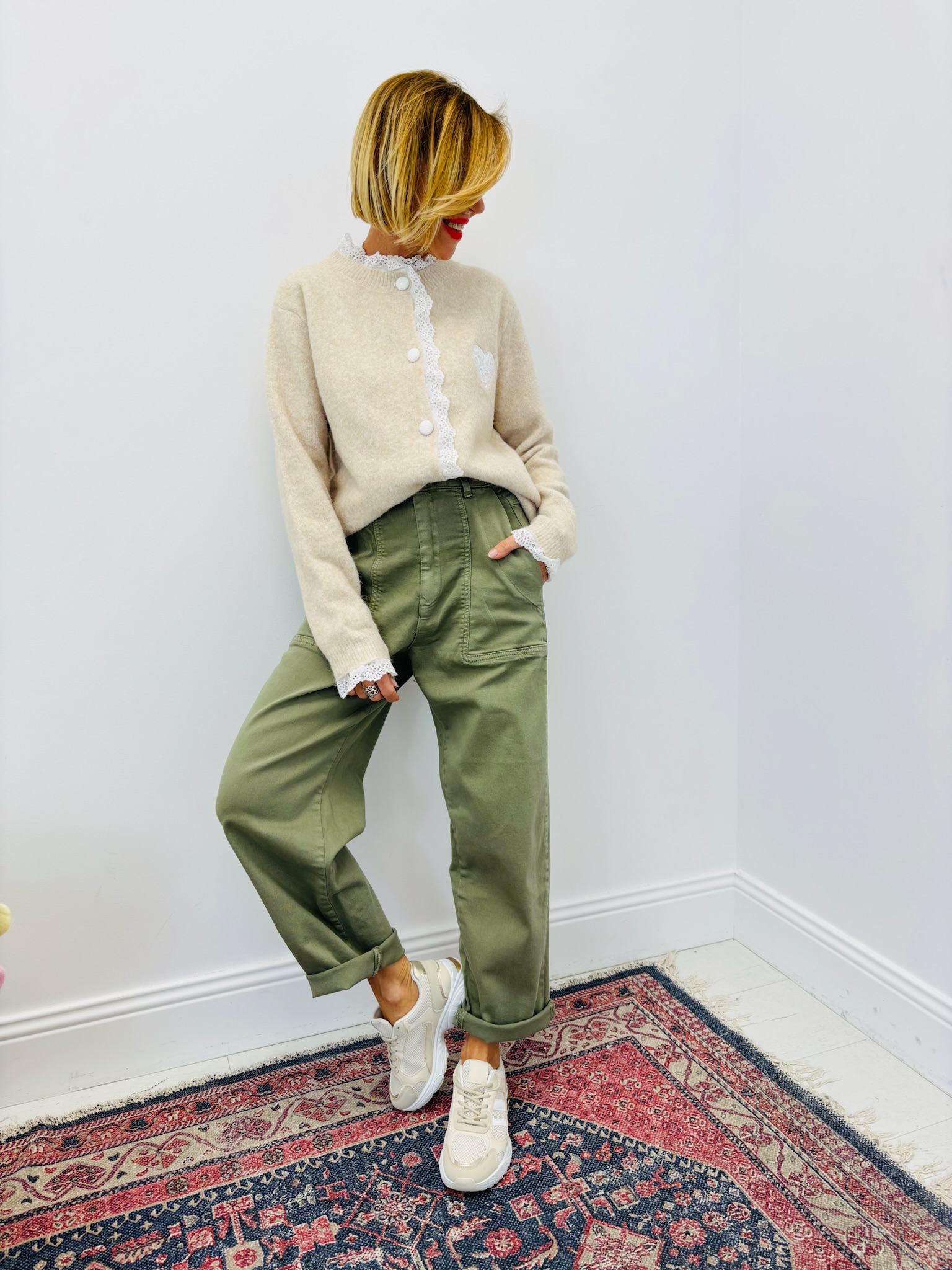 Le détail qui fait toute la différence réside dans son cœur brodé sur la poitrine, délicat et discret, associé à une finition en dentelle fine le long de la patte de boutonnage et aux poignets. Ces détails apportent une note romantique et chic, tout en restant faciles à porter au quotidien. Les boutons ton sur ton, soigneusement choisis, renforcent l’harmonie et l’élégance du modèle.