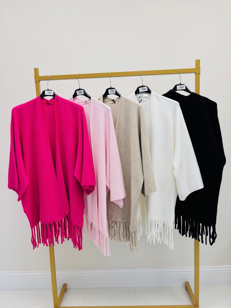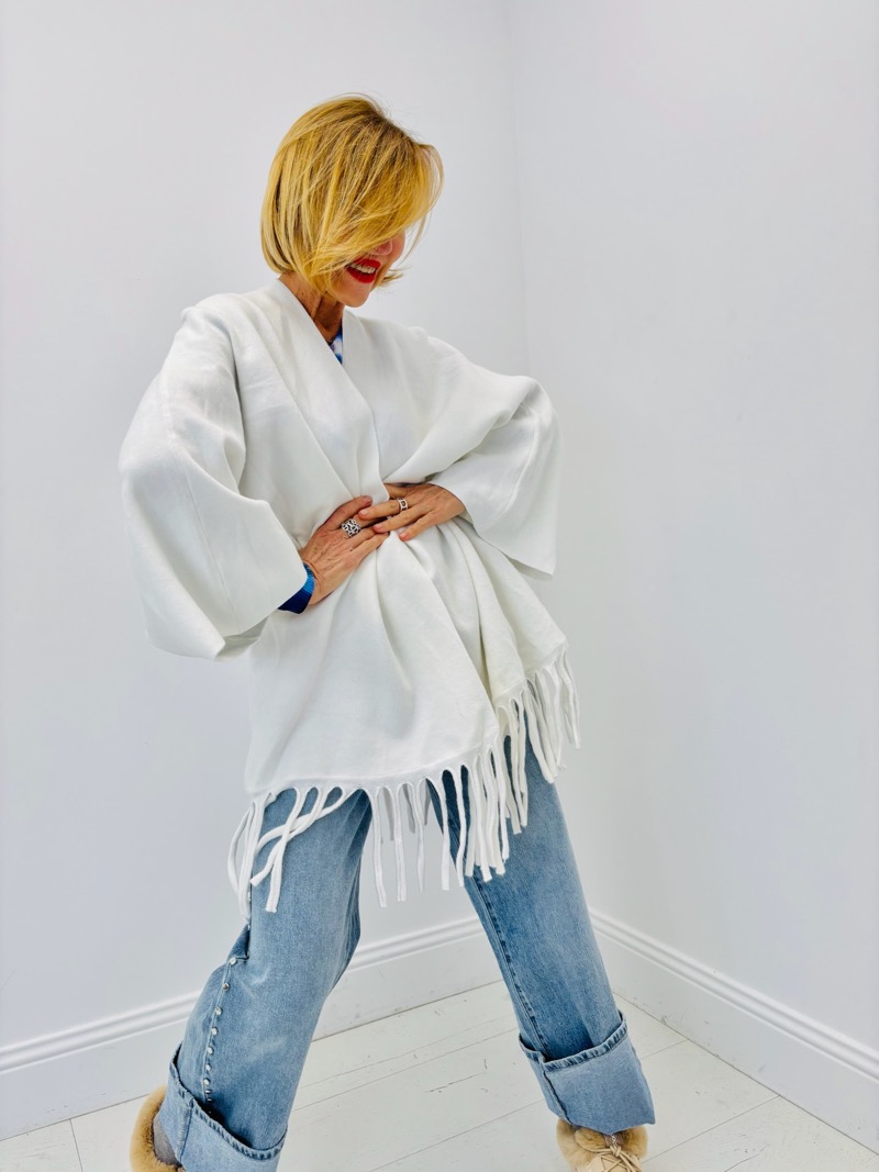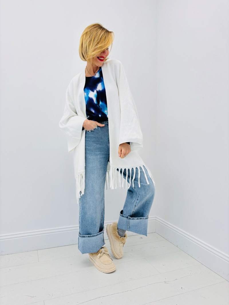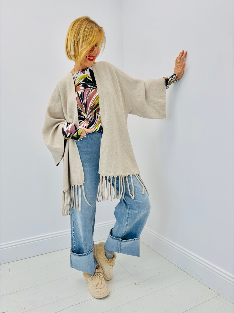 Sa coupe ample et décontractée assure un confort optimal tout en créant une allure moderne et tendance. Les manches larges apportent une touche bohème chic très actuelle, tandis que les franges en bas de vêtement ajoutent du relief et une finition travaillée, donnant du caractère à l’ensemble sans alourdir la silhouette.