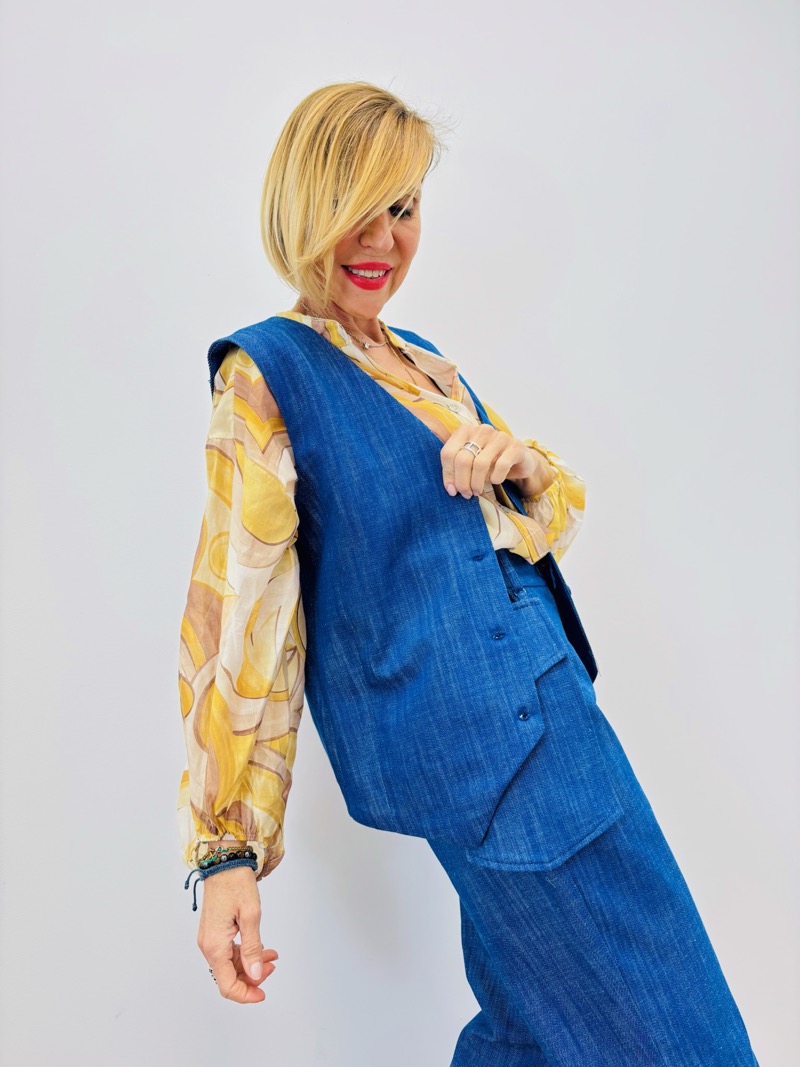 Le denim brut lumineux offre une tenue impeccable et une belle intensité de couleur. Facile à associer, il peut être porté seul façon top structuré ou superposé sur une chemise fluide pour un look plus travaillé. Son style mix & match permet également de le coordonner avec un pantalon assorti pour créer un ensemble complet tendance.