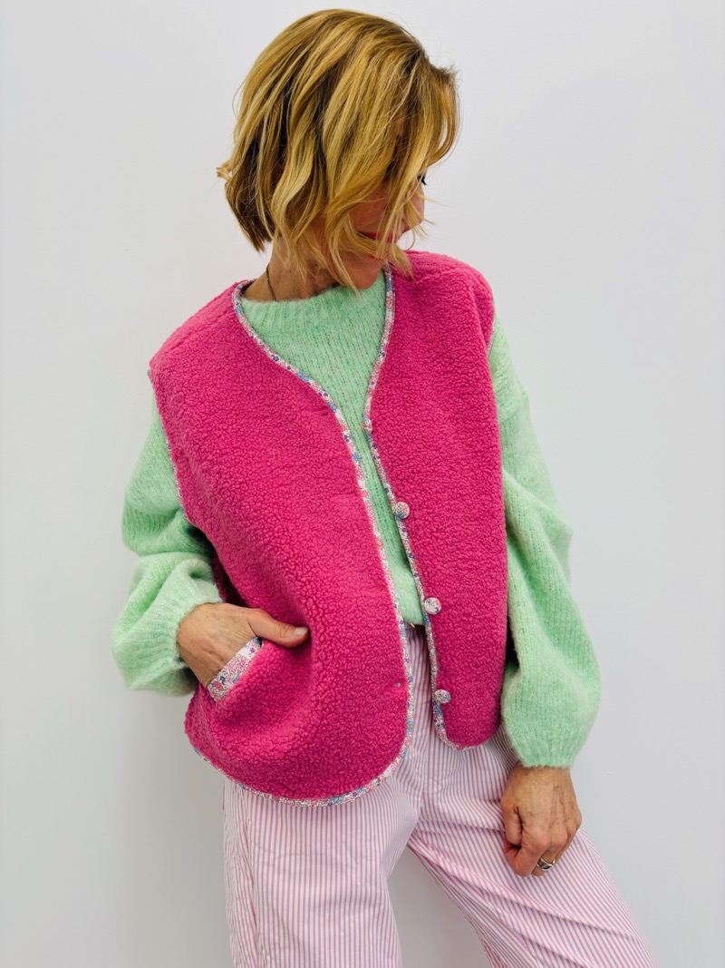 Pensé pour une clientèle à la recherche de pièces cosy, originales et faciles à associer, ce gilet moumoute couture liberty est un indispensable pour la mi-saison comme pour les journées plus fraîches.