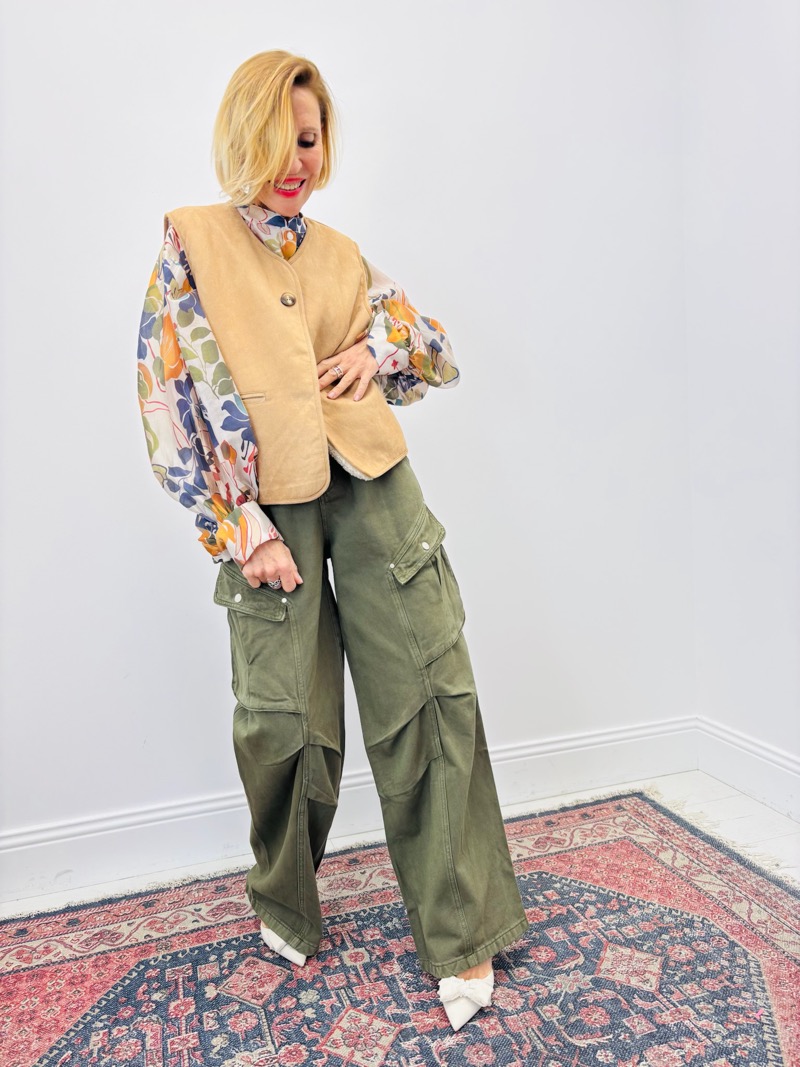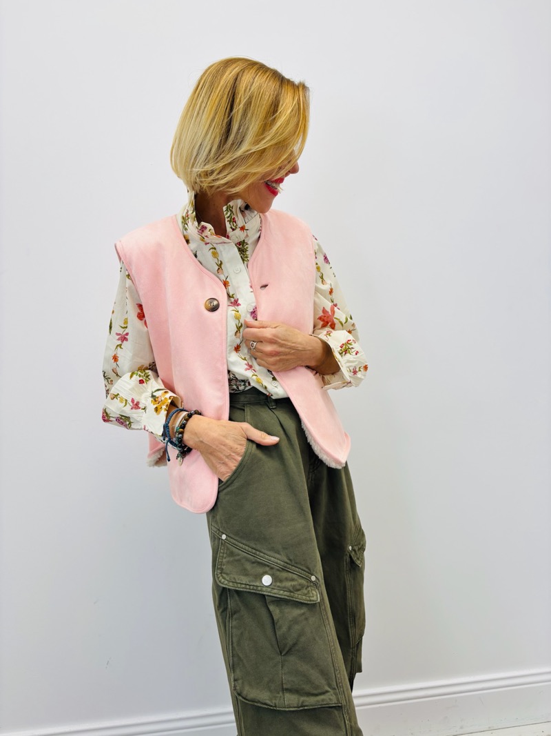 Porté sur une chemise fleurie et un pantalon cargo taille haute, ce gilet crée un contraste parfait entre esprit romantique et allure contemporaine. En version sherpa écrue, il apporte douceur et volume à la silhouette.