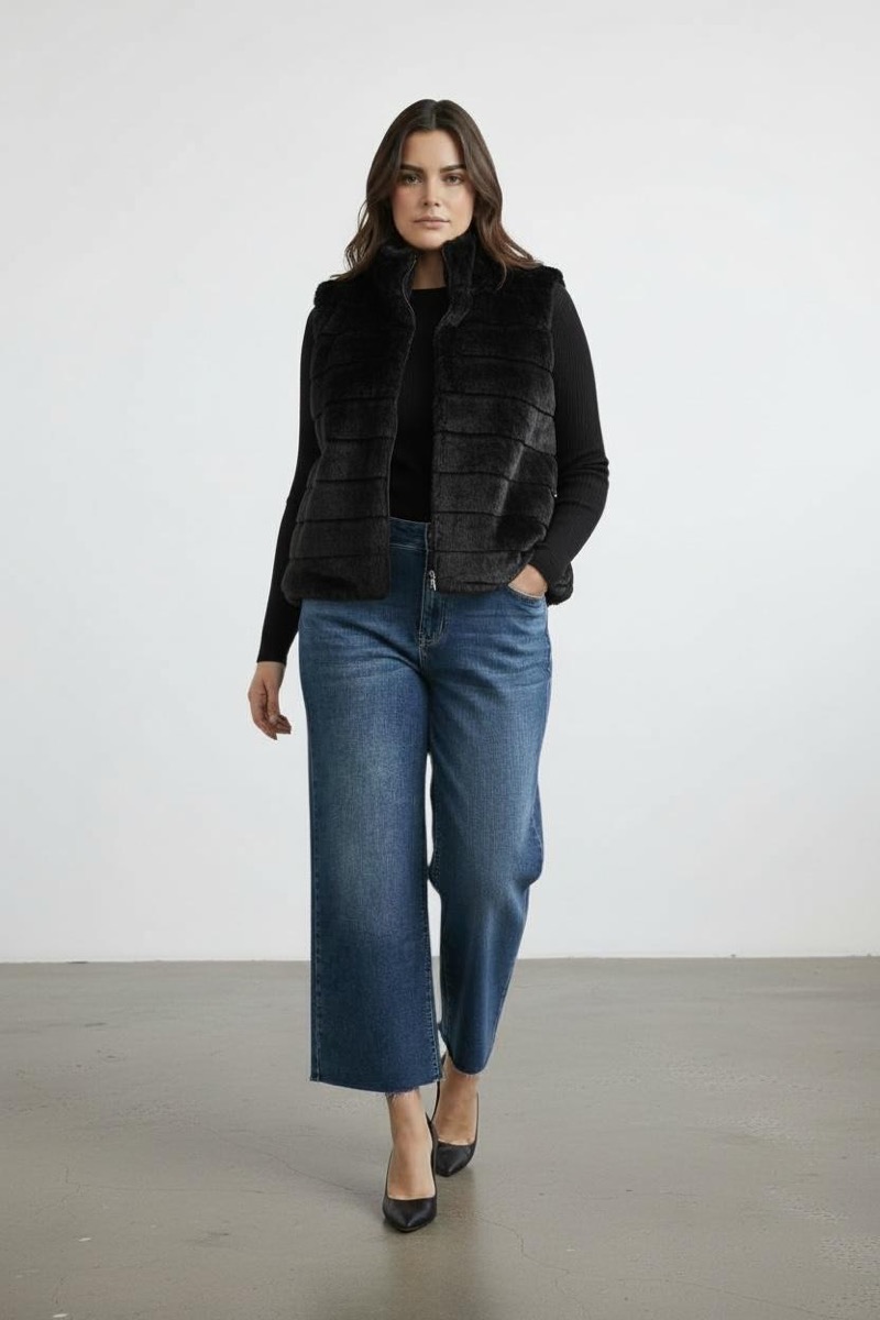 Gilet sans manches grande taille en fausse fourrure, à la fois élégant et douillet. Col montant enveloppant pour une allure chic et une protection renforcée contre le froid. Fermeture zippée sur le devant, coupe ample et confortable adaptée à toutes les morphologies. Parfait pour superposer sur un pull ou une robe pour un look d’hiver tendance. Convient jusqu’à la taille 48