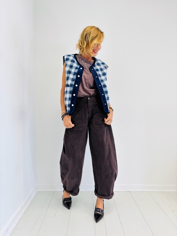 Gros crush pour ce gilet à carreaux en fausse fourrure façon mouton, parfait pour structurer vos looks d’automne-hiver. Son motif à carreaux esprit « tapis moelleux » contraste joliment avec une patte de boutonnage et des poches en velours côtelé marine.