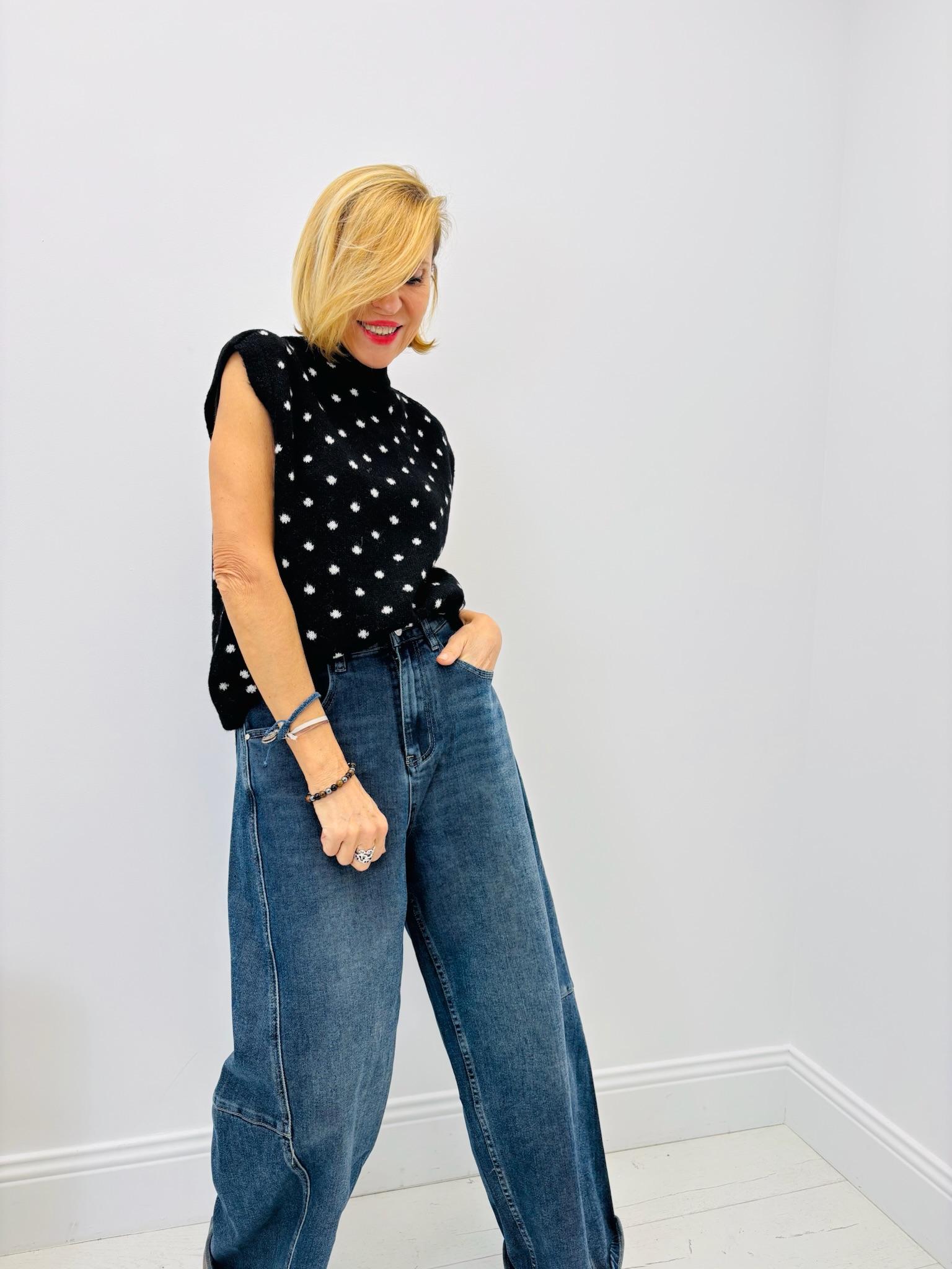 Ce gilet sans manches revisite la maille d’hiver avec une touche rétro irrésistible. Confectionné dans une matière douce enrichie de laine et de viscose, il offre chaleur et souplesse tout en affichant un motif à pois contrastés plein de charme.