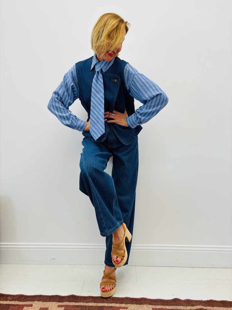 Ce gilet sans manches en denim rayé revisite les codes du tailoring avec une touche moderne et structurée. Confectionné dans un denim bleu à fines rayures verticales blanches, il allonge visuellement la silhouette tout en apportant un esprit casual chic très actuel.