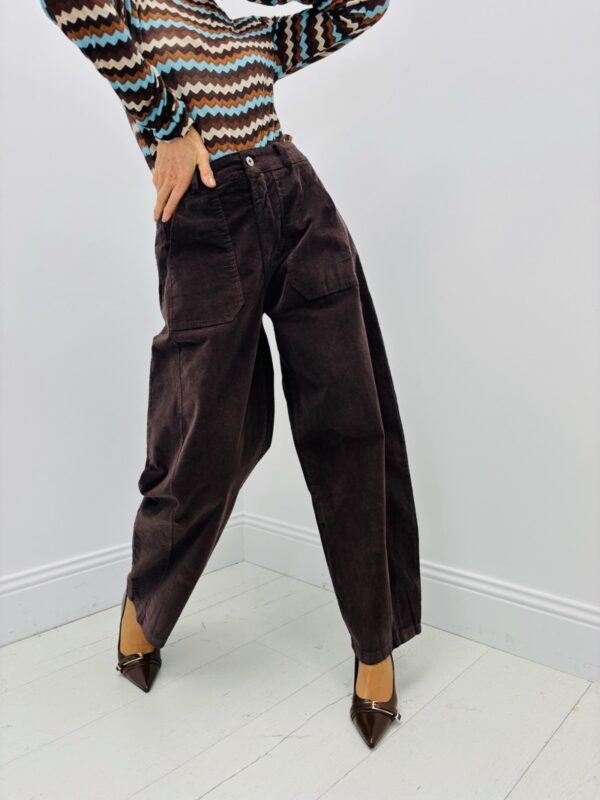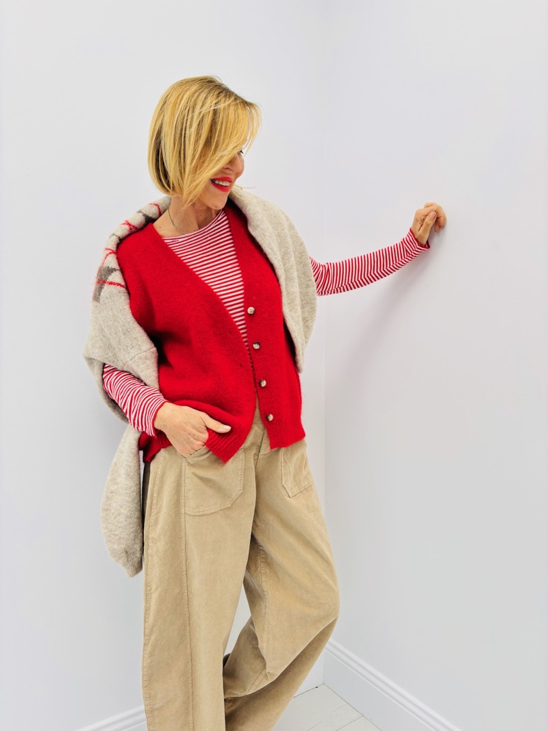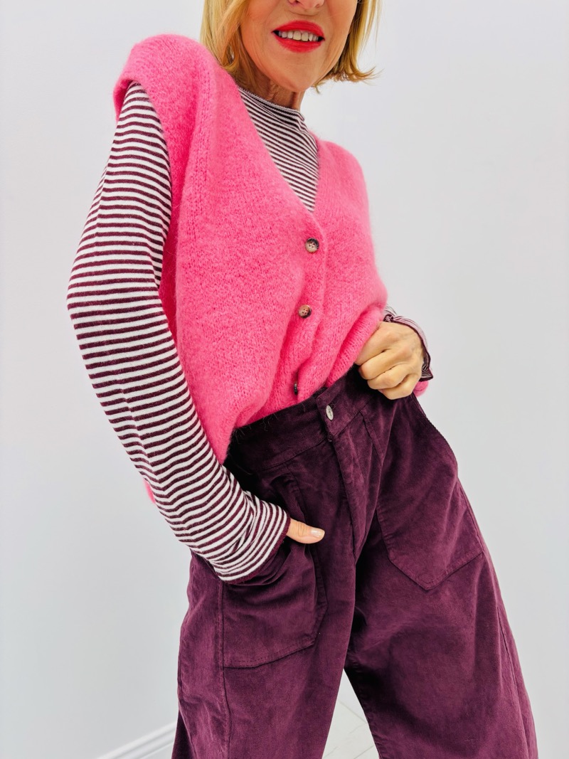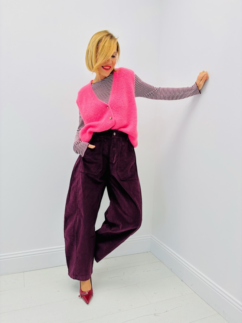 La version marron s’accorde parfaitement avec un pantalon crème pour un style lumineux, tandis que le fuchsia apporte un contraste éclatant avec un pantalon en velours prune : un look mode, féminin et très confortable.