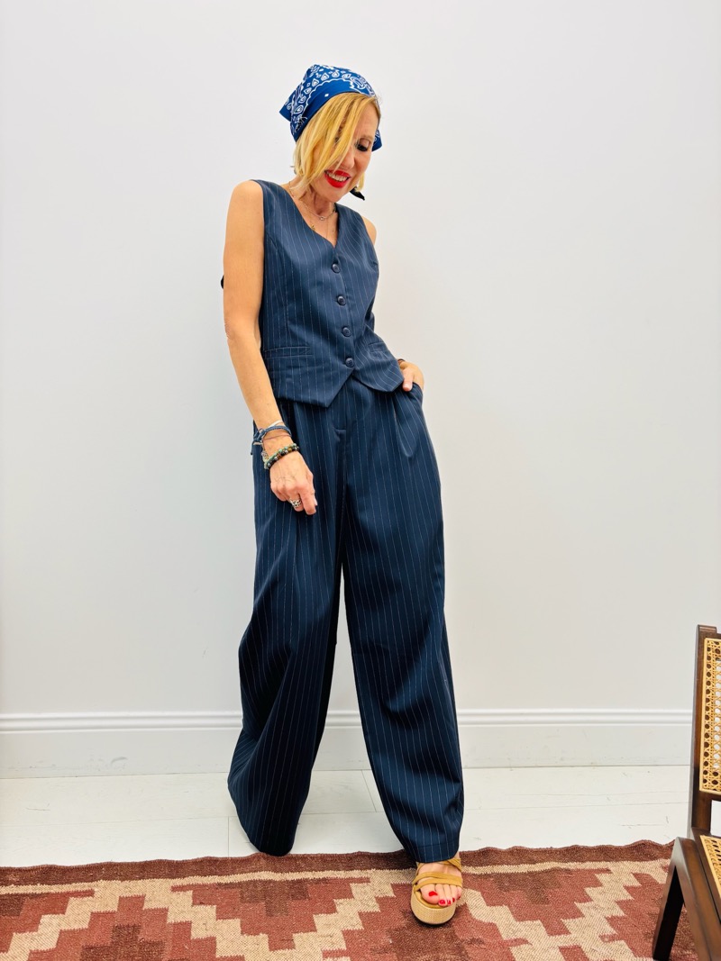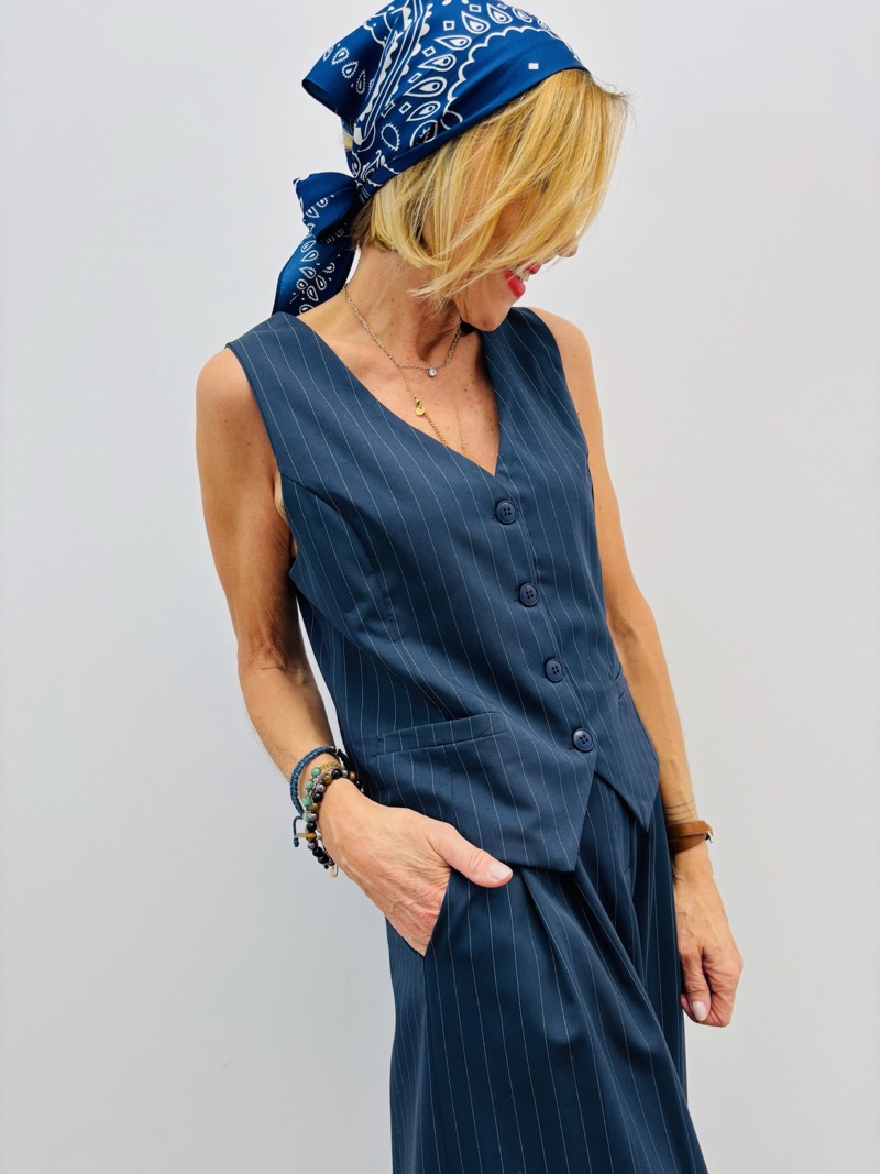 Ce gilet tailleur rayé incarne l’élégance moderne avec une touche tailoring affirmée. Décliné en marine profond ou en taupe raffiné, il est sublimé par de fines rayures verticales qui allongent visuellement la silhouette et apportent une allure sophistiquée.