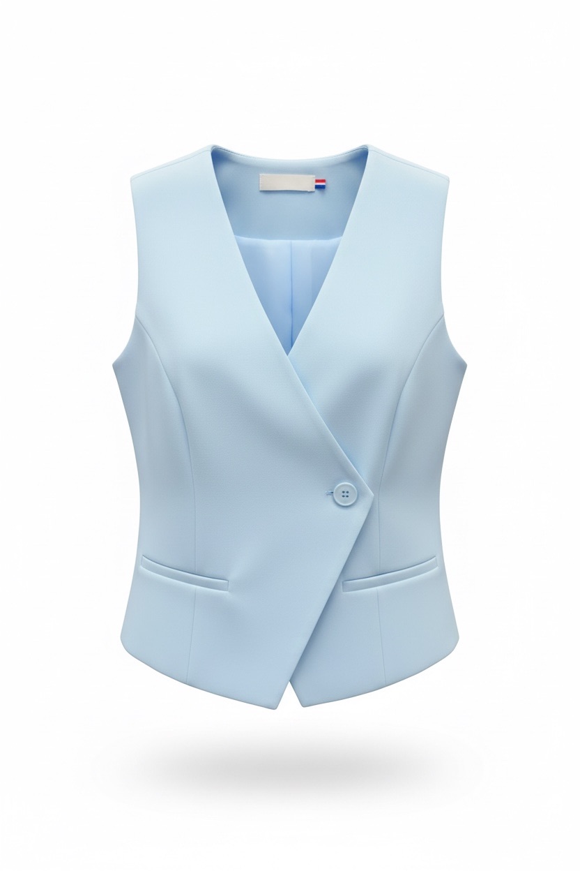 Le décolleté en V profond allonge la silhouette et permet de multiples associations, tandis que les fausses poches passepoilées renforcent l’esprit tailleur avec subtilité. Entièrement doublé, le gilet offre un tombé net et une finition soignée, gage de qualité perçue en boutique comme en e-shop.