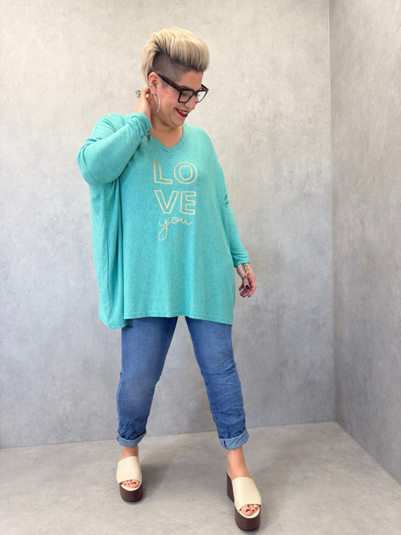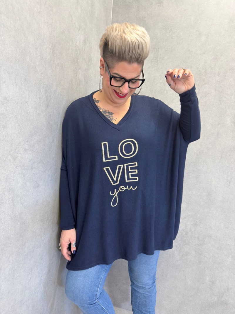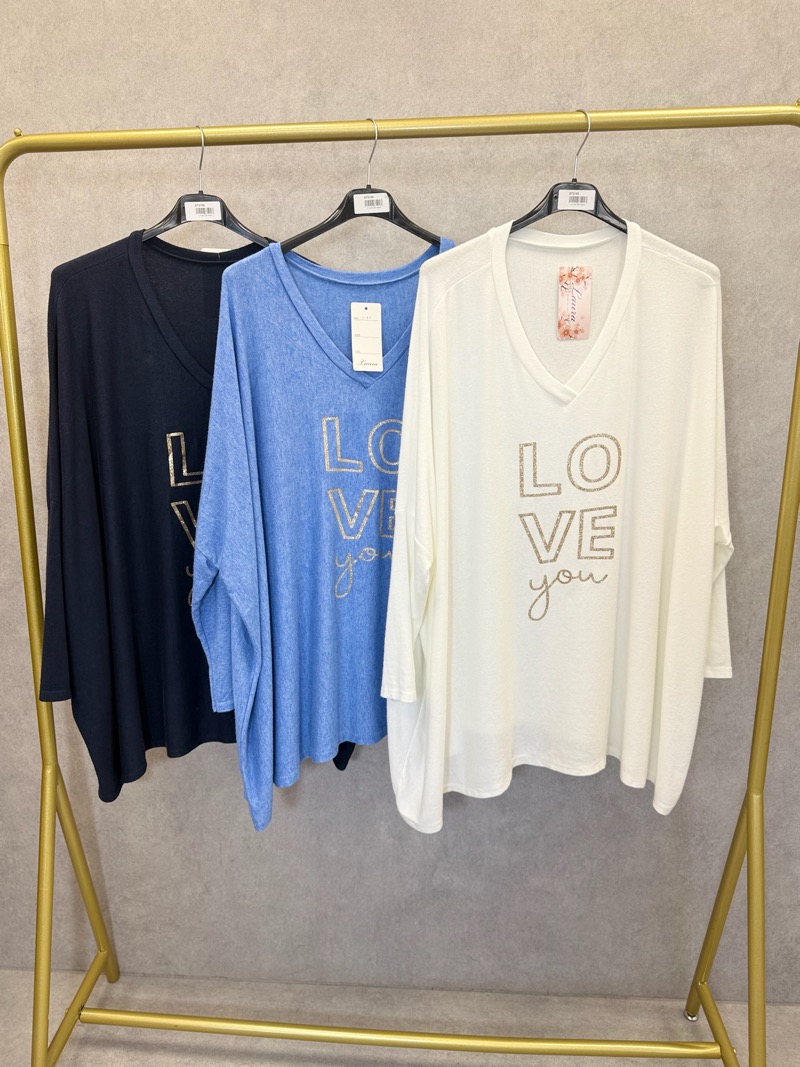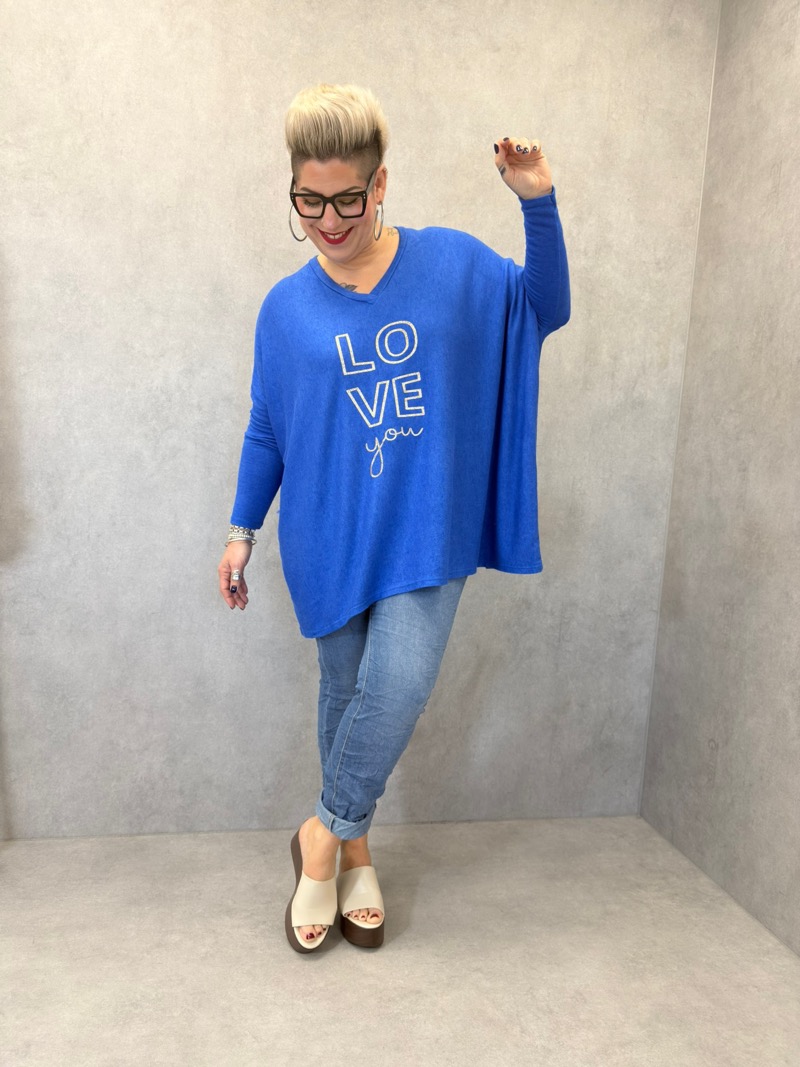 Ce haut grande taille est une pièce coup de cœur, pensée pour allier confort absolu, style décontracté et message positif. Avec son coloris bleu intense et lumineux, il apporte immédiatement de l’éclat à la silhouette et s’impose comme une pièce forte du dressing quotidien. Son inscription “LOVE you”, travaillée dans un esprit graphique et doux, apporte une touche moderne, chaleureuse et féminine.