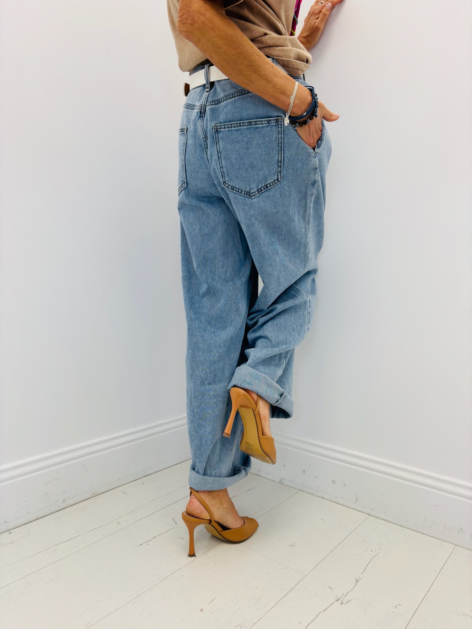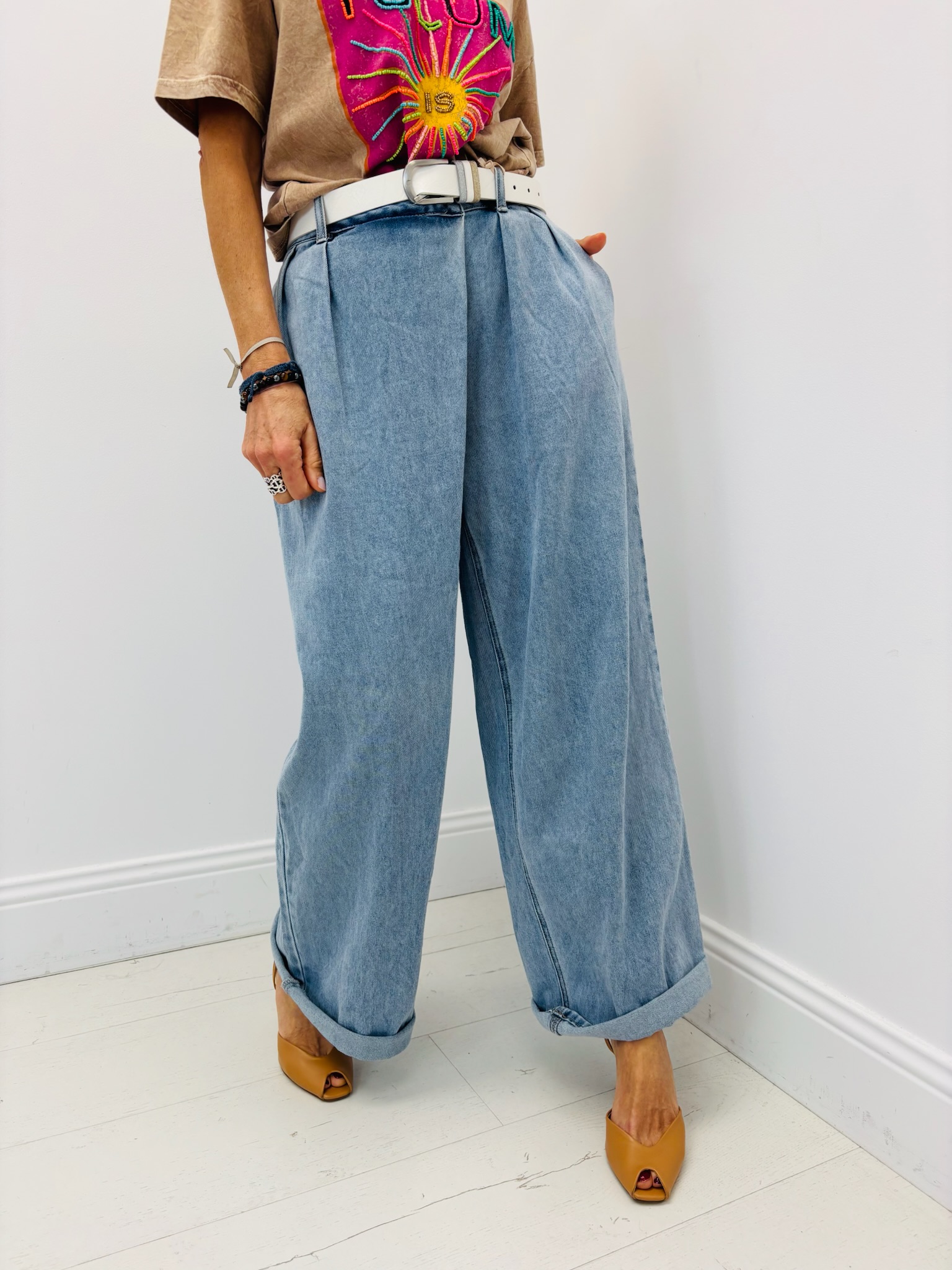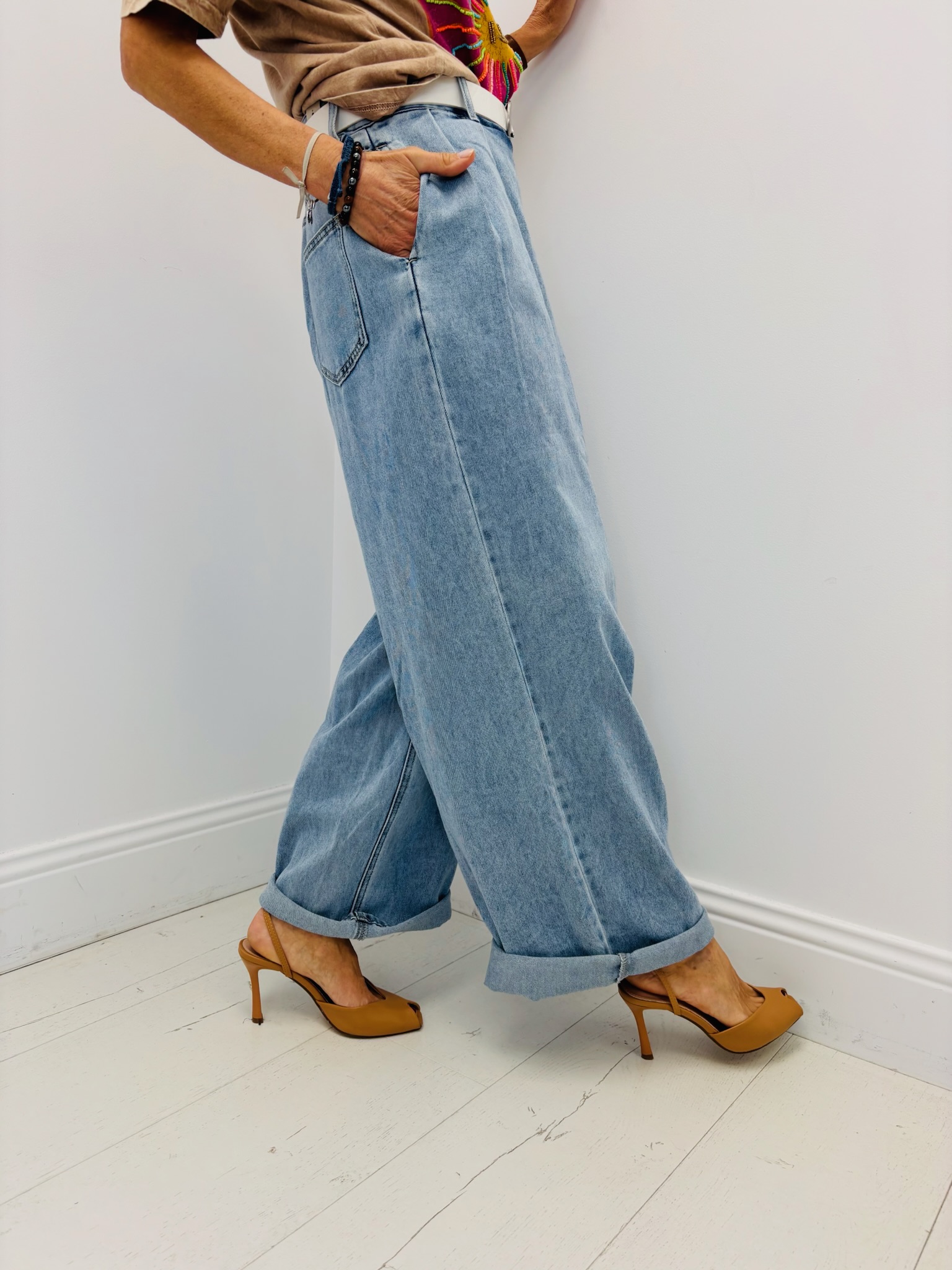 La coupe est ample et légèrement arrondie, offrant confort et modernité. Le bas peut être porté roulotté pour accentuer l’effet casual chic ou laissé droit pour un rendu plus épuré. Le délavage bleu clair apporte luminosité et fraîcheur, parfait pour la saison.